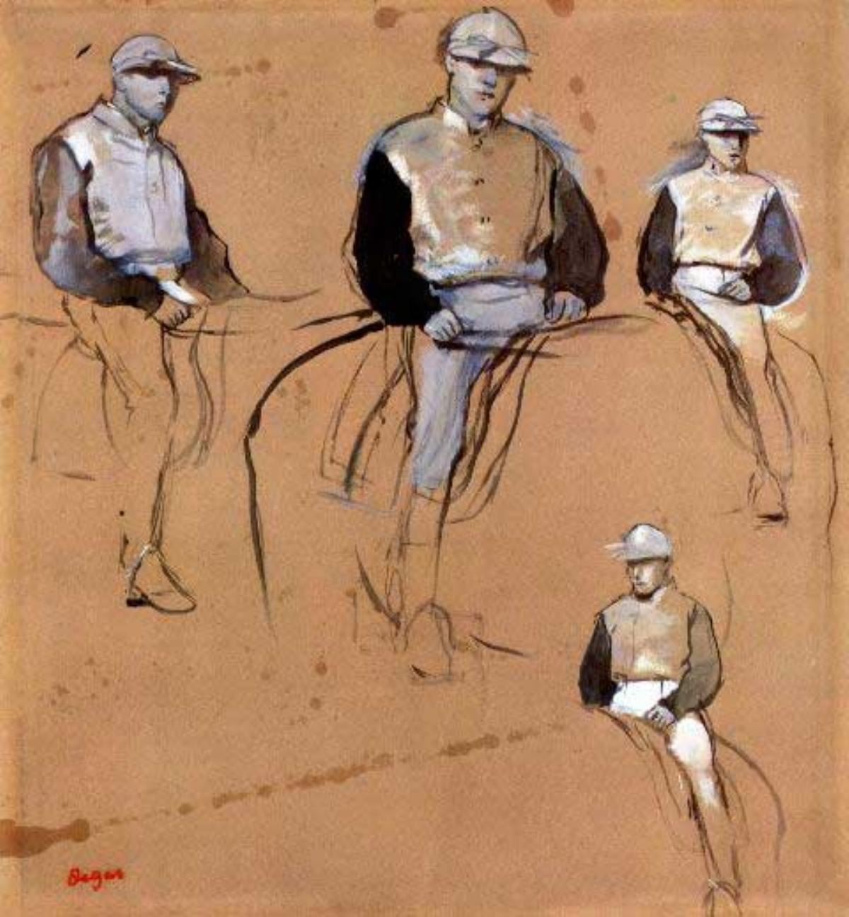 Artist: Degas - Title: Study With Four Jockeys - Medium: Fine Art Reproduction Giclee on Archival Canvas - Image Size: Approximately 20 inches x 18.5 inches - Framed: Unframed on Unstretched Canvas - Edgar Degas was a French artist famous for his work in painting, sculpture, printmaking and drawing. He is regarded as one of the founders of Impressionism although he rejected the term, and preferred to be called a realist. A superb draftsman, he is especially identified with the subject of the dance, and over half of his works depict dancers. These display his mastery in the depiction of movement, as do his racecourse subjects and female nudes. His portraits are notable for their psychological complexity and depiction of human isolation. - Early in his career, he wanted to be a history painter, a calling for which he was well prepared by his rigorous academic training and close study of classic art. In his early thirties, he changed course, and by bringing the traditional methods of a history painter to bear on contemporary subject matter, he became a classical painter of modern life.