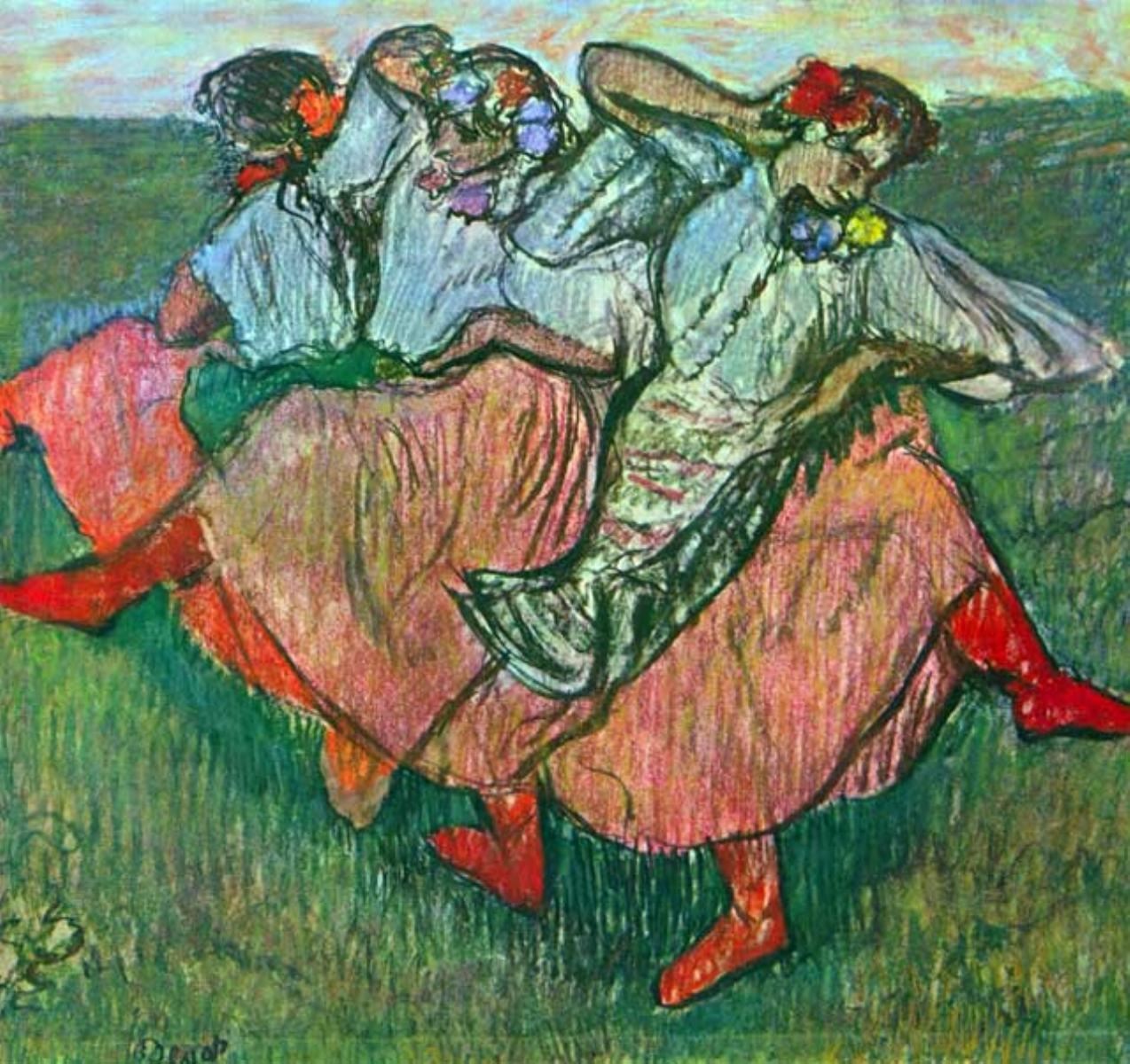 Artist: Degas - Title: Three Russian Dancers - Medium: Fine Art Reproduction Giclee on Archival Canvas - Image Size: Approximately 18.75 inches x 20 inches - Framed: Unframed on Unstretched Canvas - Edgar Degas was a French artist famous for his work in painting, sculpture, printmaking and drawing. He is regarded as one of the founders of Impressionism although he rejected the term, and preferred to be called a realist. A superb draftsman, he is especially identified with the subject of the dance, and over half of his works depict dancers. These display his mastery in the depiction of movement, as do his racecourse subjects and female nudes. His portraits are notable for their psychological complexity and depiction of human isolation. - Early in his career, he wanted to be a history painter, a calling for which he was well prepared by his rigorous academic training and close study of classic art. In his early thirties, he changed course, and by bringing the traditional methods of a history painter to bear on contemporary subject matter, he became a classical painter of modern life.