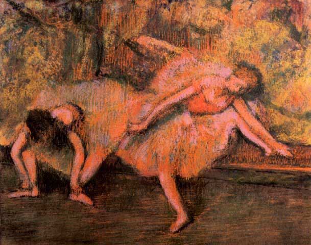 Artist: Degas - Title: Two Dancers On A Bank - Medium: Fine Art Reproduction Giclee on Archival Canvas - Image Size: Approximately 15.75 inches x 20 inches - Framed: Unframed on Unstretched Canvas - Edgar Degas was a French artist famous for his work in painting, sculpture, printmaking and drawing. He is regarded as one of the founders of Impressionism although he rejected the term, and preferred to be called a realist. A superb draftsman, he is especially identified with the subject of the dance, and over half of his works depict dancers. These display his mastery in the depiction of movement, as do his racecourse subjects and female nudes. His portraits are notable for their psychological complexity and depiction of human isolation. - Early in his career, he wanted to be a history painter, a calling for which he was well prepared by his rigorous academic training and close study of classic art. In his early thirties, he changed course, and by bringing the traditional methods of a history painter to bear on contemporary subject matter, he became a classical painter of modern life.
