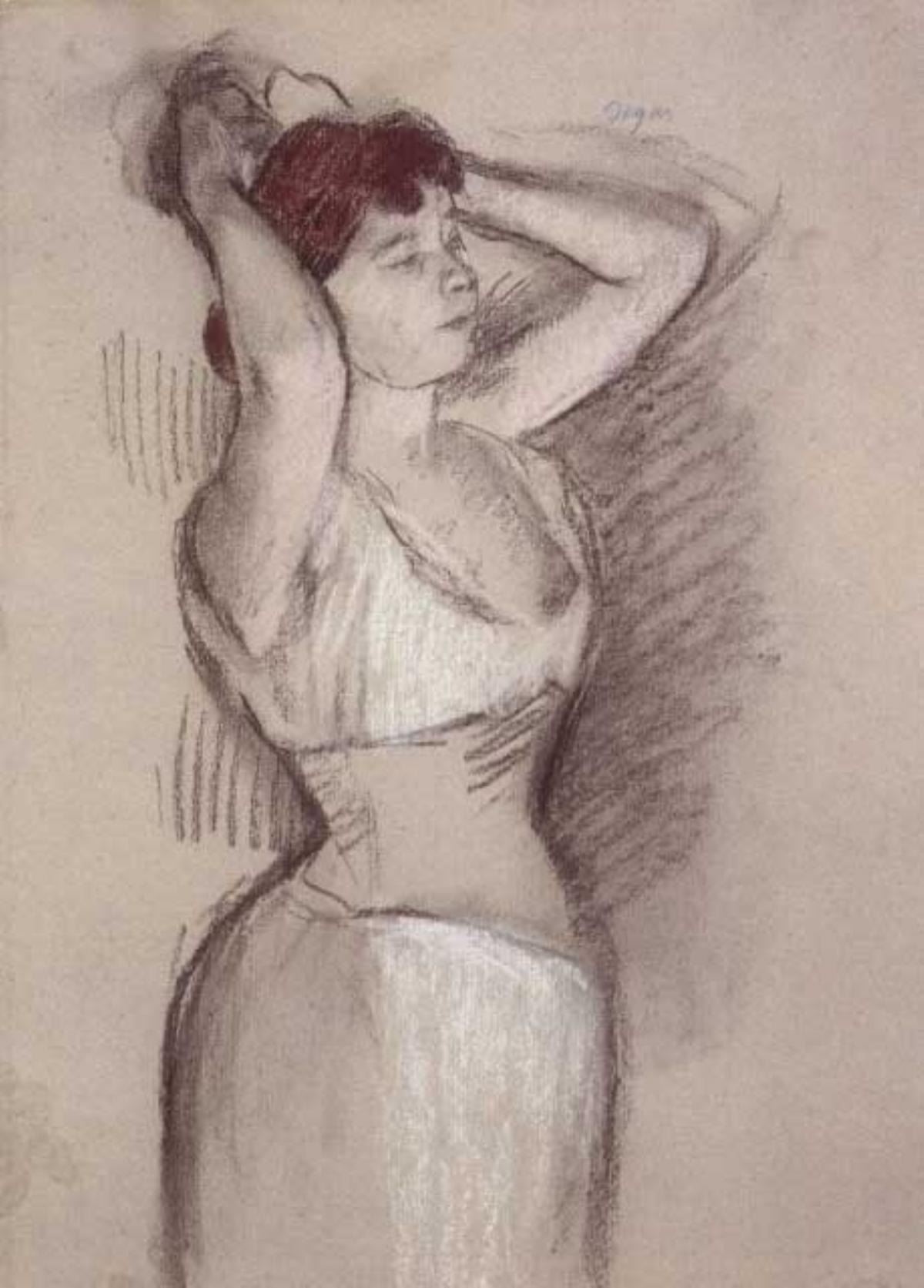 Artist: Degas - Title: Woman Doing Hair    - Medium: Fine Art Reproduction Giclee on Archival Canvas - Image Size: Approximately 25.25 inches x 32 inches - Framed: Unframed on Unstretched Canvas - Edgar Degas was a French artist famous for his work in painting, sculpture, printmaking and drawing. He is regarded as one of the founders of Impressionism although he rejected the term, and preferred to be called a realist. A superb draftsman, he is especially identified with the subject of the dance, and over half of his works depict dancers. These display his mastery in the depiction of movement, as do his racecourse subjects and female nudes. His portraits are notable for their psychological complexity and depiction of human isolation. - Early in his career, he wanted to be a history painter, a calling for which he was well prepared by his rigorous academic training and close study of classic art. In his early thirties, he changed course, and by bringing the traditional methods of a history painter to bear on contemporary subject matter, he became a classical painter of modern life.