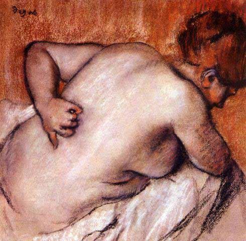 Artist: Degas - Title: Womans Back - Medium: Fine Art Reproduction Giclee on Archival Canvas - Image Size: Approximately 19.5 inches x 20 inches - Framed: Unframed on Unstretched Canvas - Edgar Degas was a French artist famous for his work in painting, sculpture, printmaking and drawing. He is regarded as one of the founders of Impressionism although he rejected the term, and preferred to be called a realist. A superb draftsman, he is especially identified with the subject of the dance, and over half of his works depict dancers. These display his mastery in the depiction of movement, as do his racecourse subjects and female nudes. His portraits are notable for their psychological complexity and depiction of human isolation. - Early in his career, he wanted to be a history painter, a calling for which he was well prepared by his rigorous academic training and close study of classic art. In his early thirties, he changed course, and by bringing the traditional methods of a history painter to bear on contemporary subject matter, he became a classical painter of modern life.
