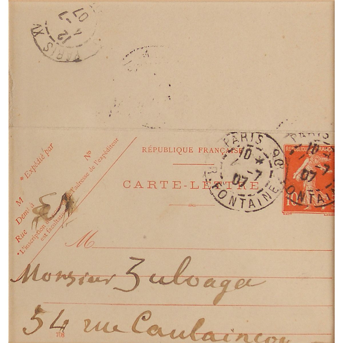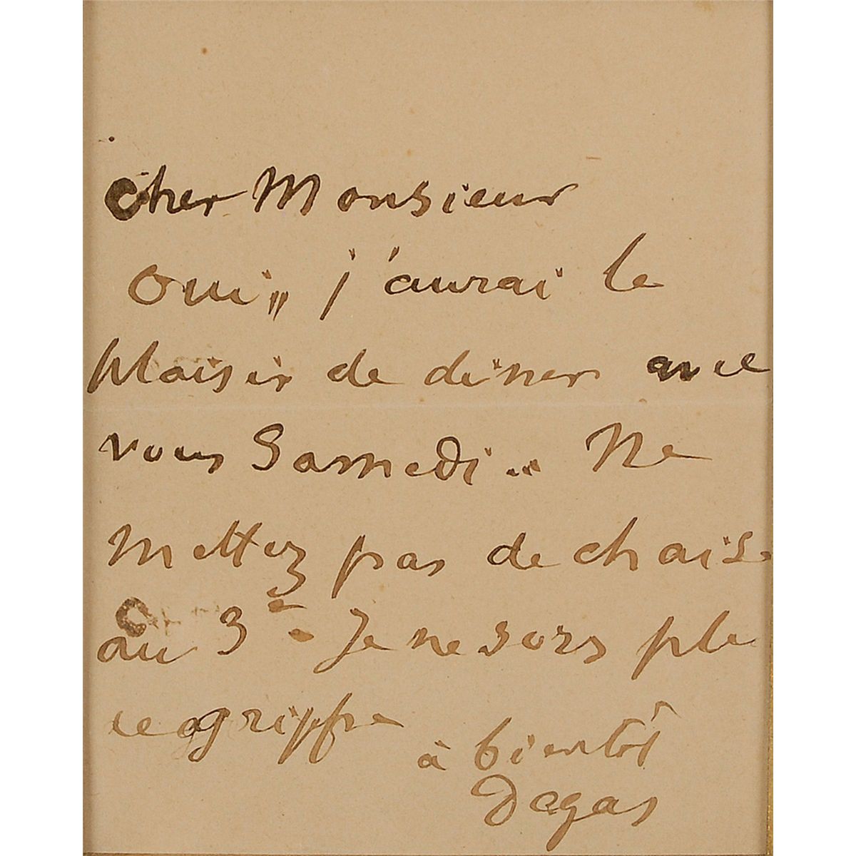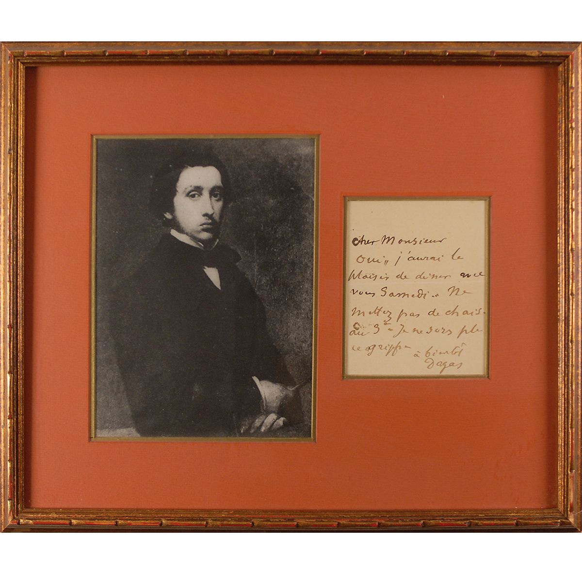 Important French painter and sculptor (1834–1917), one of the seminal figures of Impressionism, best known for his images of dancers. ALS in French, signed “Degas,” one page, 4.25 x 5.25, no date. Letter to famed Spanish painter Ignacio Zuloaga. In full (translated): “Yes, I will have the pleasure to dine with you, Saturday. Do not put the chair on 3rd (floor). I can't get rid of my cold. See you soon.” Matted and framed with a portrait of Degas to an overall size of 17.75 x 15. In fine condition, with a uniform shade of mild toning. Zuloaga was an admirer of Degas and was a close friend of his, and was also acquainted with Rodin and Gaugin.