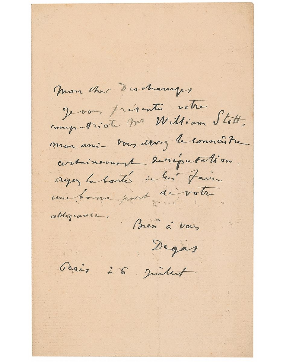 By the late 1880s, Degas had already received international recognition as an important artist. In this letter, he introduces the burgeoning British painter William Stott-of-Oldham to Charles Deschamps, manager of the Galerie Durand-Ruel et Cie in Paris. Exhibiting Impressionist works at his own galleries despite critics’ initial resistance, dealer Paul Durand-Ruel essentially created the market for Impressionism, establishing the biggest names in the movement, including Degas, Manet, Monet, Pissarro, and Renoir. A good word from one of his highly respected artists had the power to make a newcomer’s career, and it did just that for Stott. In 1889, he held his first one-man show at the Galerie to great critical reception, pushing him into the international art world. The established artist speaking out on behalf of an up-and-comer, this is a wonderful note involving three major figures in art history.