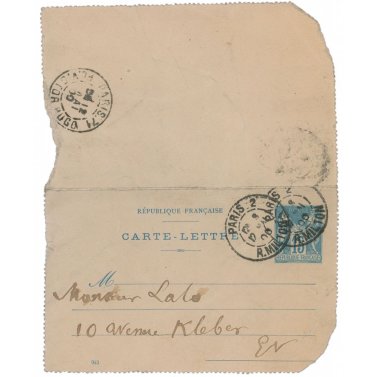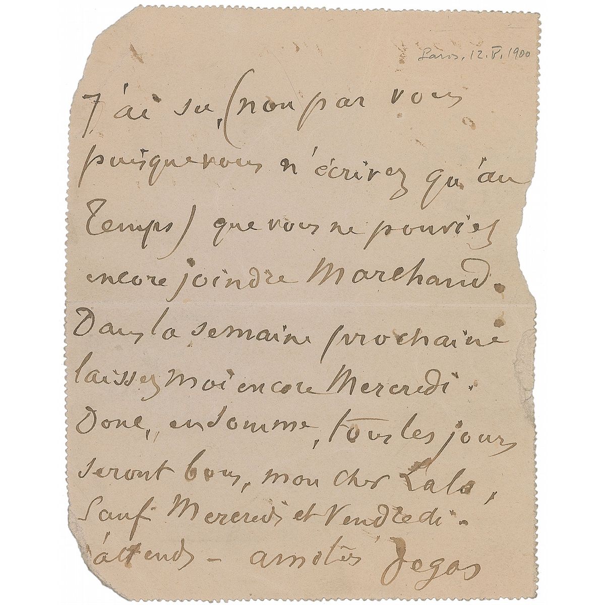 ALS in French, signed “Degas,” one page, 4.5 x 5.5, postmarked May 12, 1900. Letter to his friend the journalist Pierre Lalo in Paris. In part (translated): “I knew…that you could still join Marchand…in short, every day will be good, dear Lalo, except Wednesday and Friday.” Addressed on the reverse in Degas’ hand. Some paper loss to edges and corners (affecting a single letter of the closing sentiment), otherwise fine condition. A boldly penned letter from a period in which Degas made some of his most famous paintings of dances and racehorses.