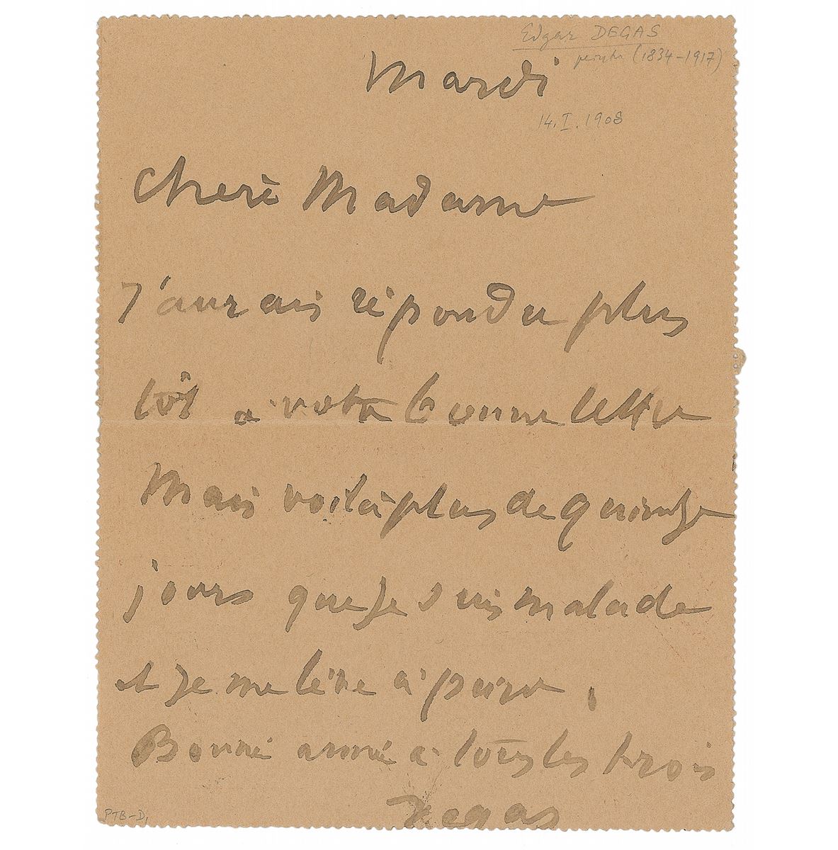 Important French painter and sculptor (1834–1917) regarded as one of the founders of Impressionism. ALS in French, signed “Degas,” one page, 4.25 x 5.5, January 14, 1908. Letter to Madame du Puigaudeau, the wife of painter Ferdinand du Puigaudeau. In full (translated): "I would have answered sooner to your good letter but it's been more than two weeks that I've been sick and I can barely get up. A good year to the three of you.” Addressed on the reverse in Degas’s hand. In fine condition. Ferdinand du Puigaudeau, known for his vibrant portrayals of twilight landscapes, was a close friend of Degas and classed with the post-Impressionists. An excellent association between friends and contemporaries working during these important artistic movements.