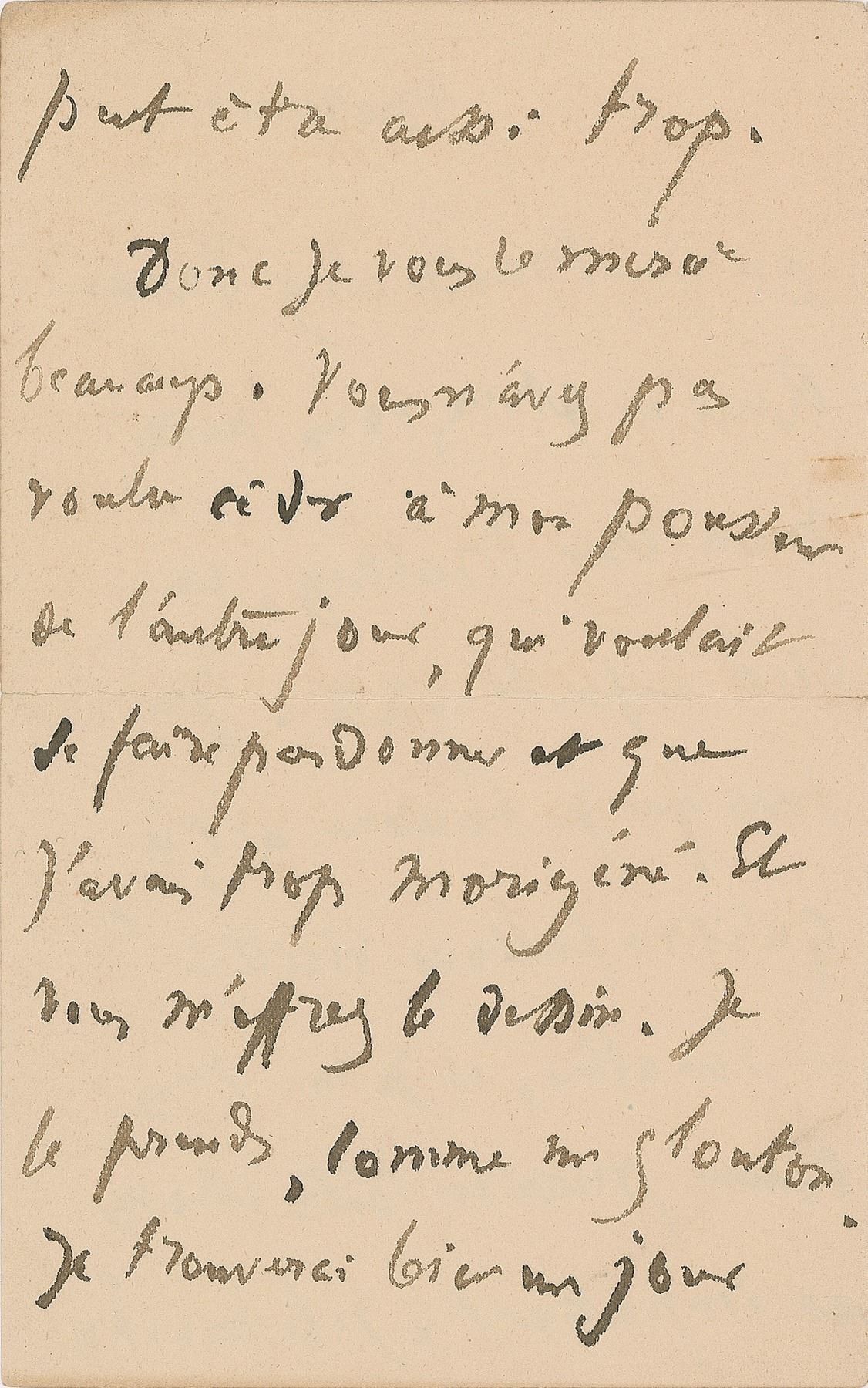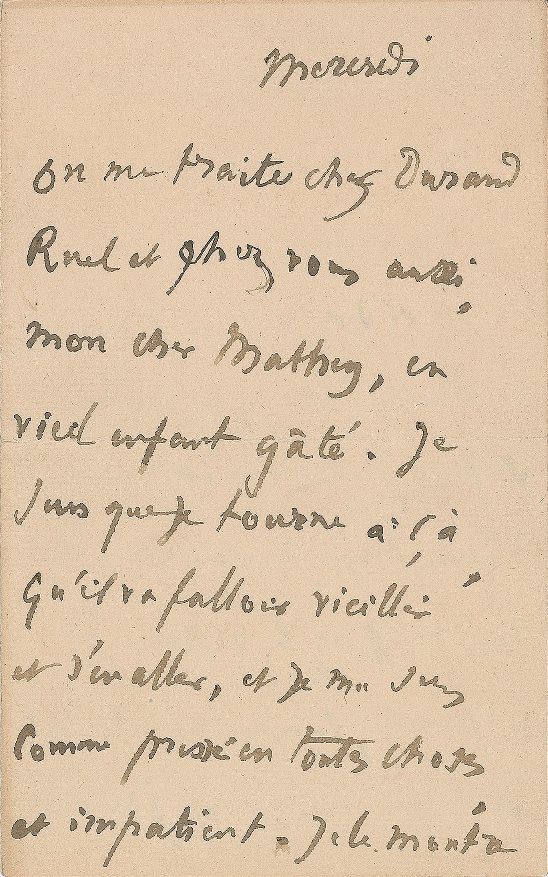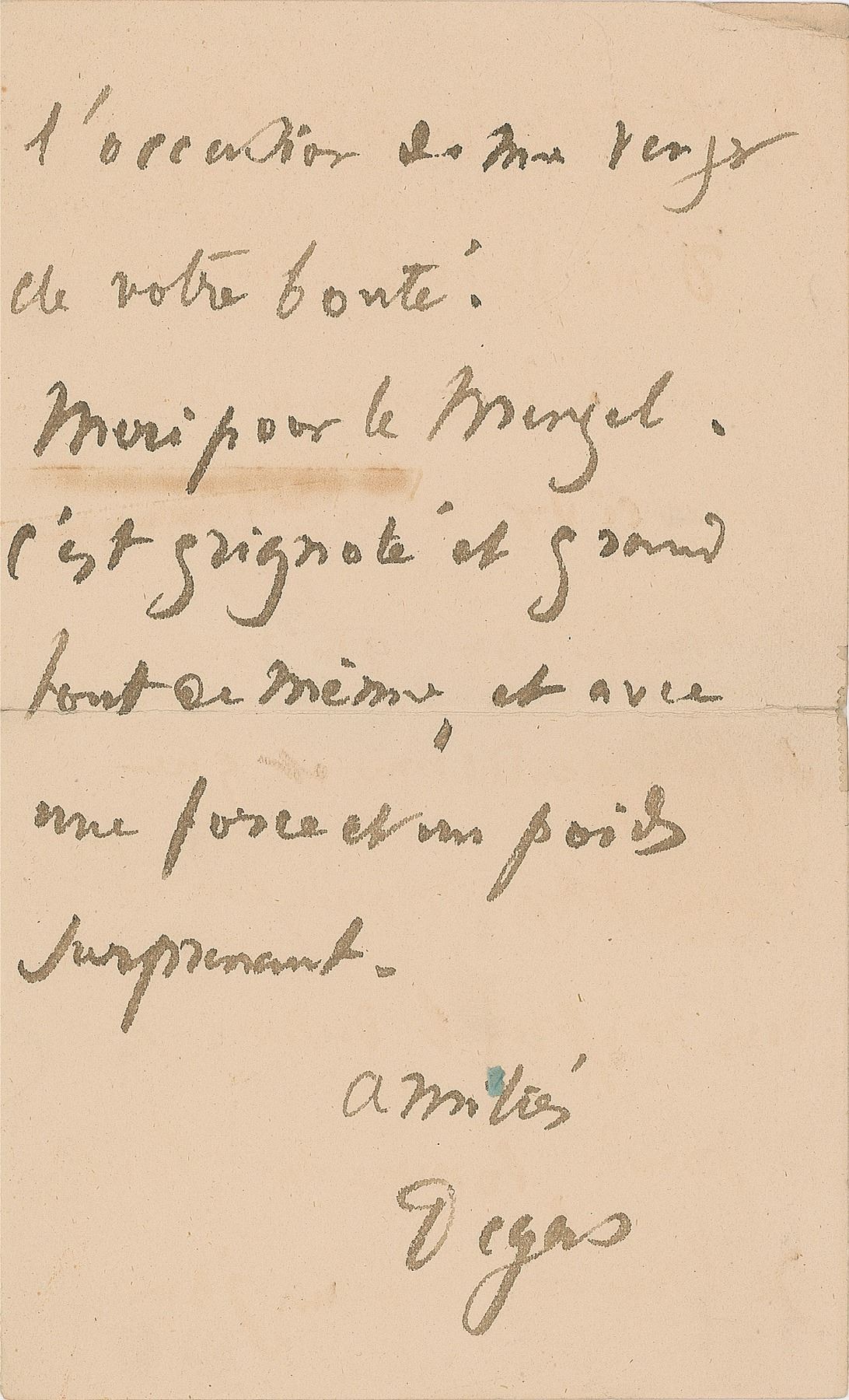 ALS in French, signed “Degas,” three pages on two adjoining sheets, 4.5 x 7, no date. Letter to fellow painter Paul Mathey, referencing the famous art dealer Paul Durand-Ruel, in part (translated): "They treat me at Durand Ruel and at your house too, my dear Mathey, as a spoiled old child. I’ve been realizing that I am turning into that. We all have to get older and go away, and I feel as if in a hurry in all things and impatient. I may show it too much. So thank you very much. You did not want to give in to my pusher the other day, who wanted to be forgiven, and that I had too much morality. And you offer me the drawing. I take it like a wolverine. I will one day find an opportunity to avenge myself from your kindness. Thanks for the Menzel [German painter Adolph Menzel]. It’s nibbled and great anyway, with amazing strength and weight." In fine condition, with a piece of old clear tape on the reverse of the final page.