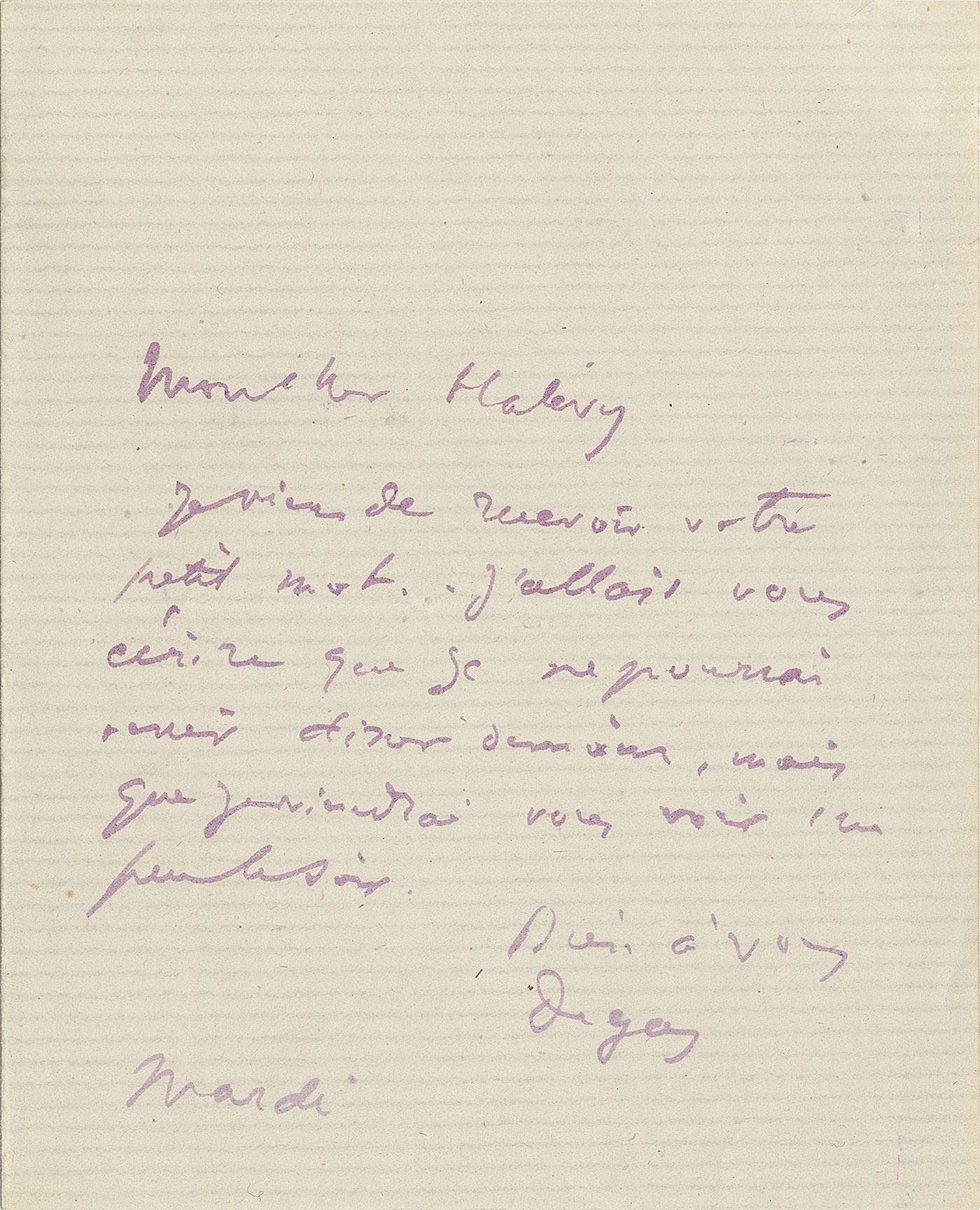 Scarce ALS in French, signed “Degas,” one page, 4 x 5, no date. Letter to his close friend, Ludovic Halevy, the writer and librettist of Carmen, informing him that he will not be able to attend dinner, but promises that he will come visit. In fine condition. Handwritten letters and notes by Degas are quite scarce and do not come to market often. Degas executed gelatin silver prints of numerous members of the Halevy family. A superb artistic association piece.