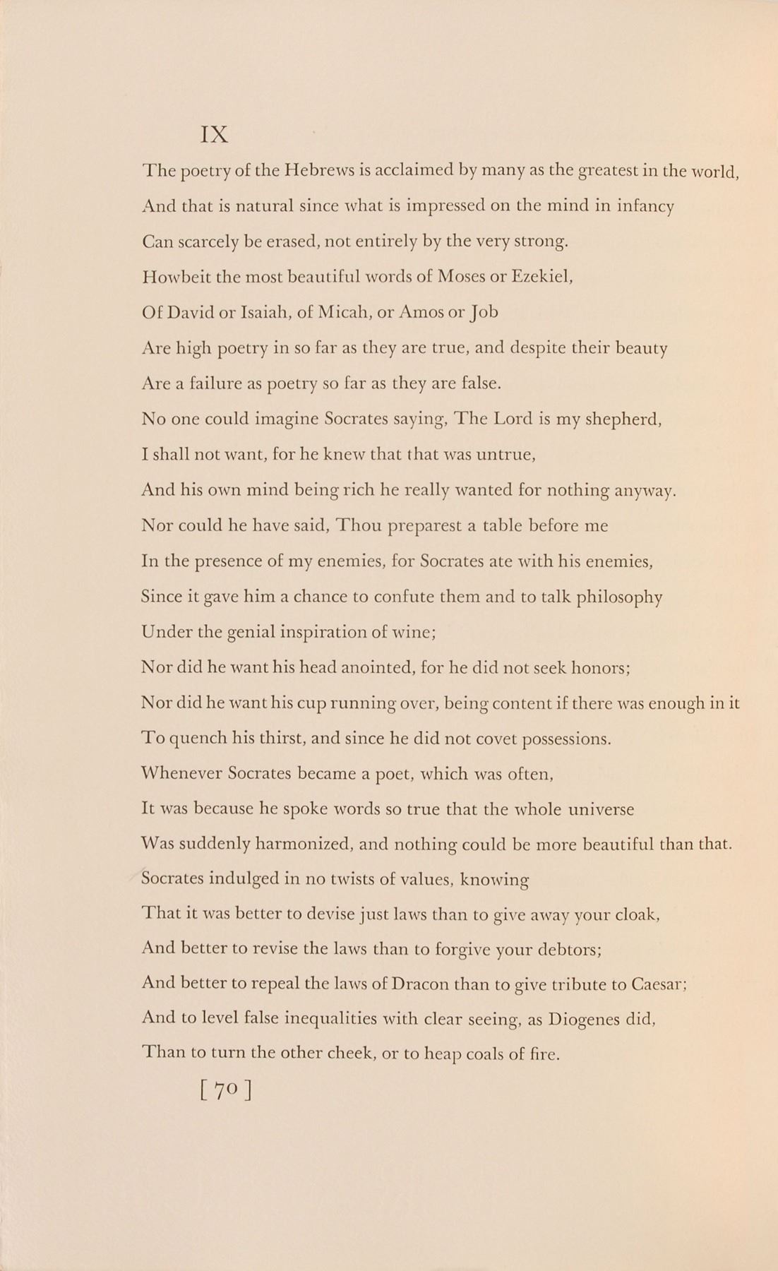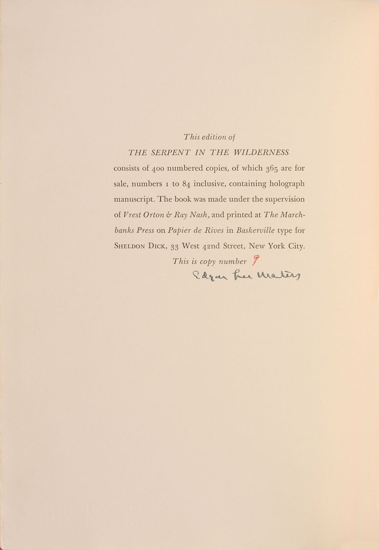 Signed book: The Serpent in the Wilderness. Limited edition, numbered 9/400. NY: Sheldon Dick, 1933. Hardcover, 8.25 x 11.5, 91 pages. Signed on the colophon in fountain pen by Masters; the original handwritten manuscript page for text appearing on pages 70-71 is tipped in opposite the title page. Numbers 1-84 of this limited edition contained a page from Masters's manuscript. In fine condition.