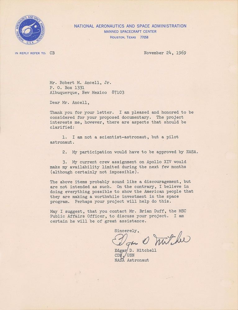 TLS signed “Edgar D. Mitchell,” one page, 8 x 10.5, NASA letterhead, November 24, 1969. Letter to Robert M. Ancell, Jr., in part: "I am pleased and honored to be considered for your proposed documentary. The project interests me, however, there are aspects that should be clarified: 1. I am not a scientist-astronaut, but a pilot astronaut. 2. My participation would have to be approved by NASA. 3. My current crew assignment on Apollo XIV would make my availability limited during the next few months (although certainly not impossible)…I believe in doing everything possible to show the American people that they are making a worthwhile investment in the space program. Perhaps your project will help do this." In fine condition. Mitchell was the Lunar Module Pilot for Apollo 14, which flew to the moon a little over a year later in January 1971.
