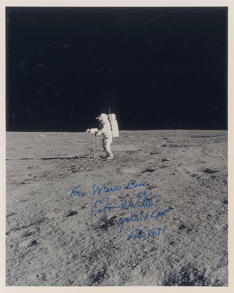 Two photos: an official color 10 x 8 NASA lithograph of Mitchell wearing his white space suit and posing in front of a large Apollo 14 mission emblem, signed and inscribed in black felt tip, "To Steve, Best wishes, Ed Mitchell"; and a color semi-glossy 8 x 10 full-length photo of Mitchell using a camera on the lunar surface, signed in blue felt tip, "Fra Mauro base, Edgar Mitchell, Apollo 14 LMP, Feb 1971." In overall fine condition, with signature contrast to the moon photo.