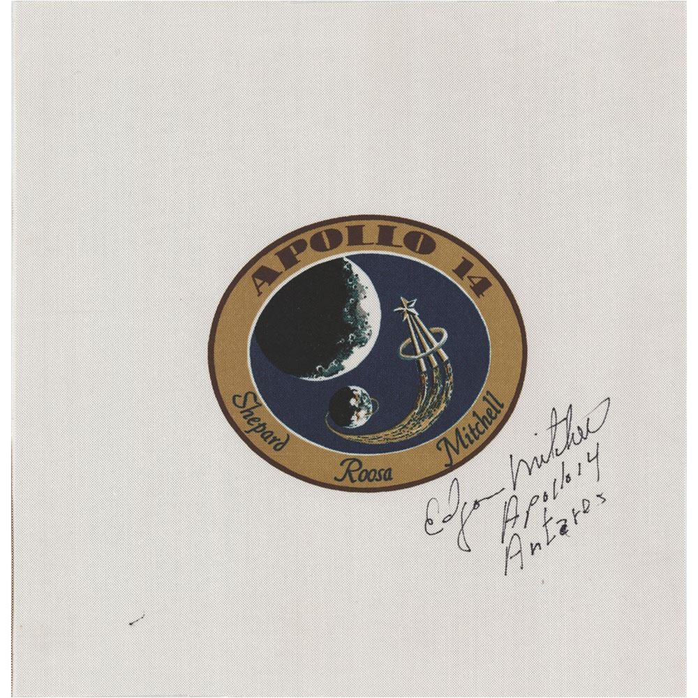 An 8.5 x 9 swatch of Beta cloth bearing a central design of the Apollo 14 mission insignia, signed in black ink, "Edgar Mitchell, Apollo 14, Antares." In fine condition.