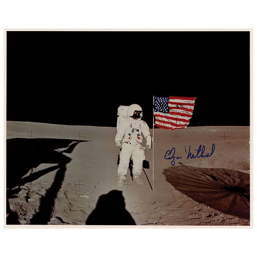 Color semi-glossy 20 x 16 photo of Edgar Mitchell standing beside the American flag during an Apollo 14 EVA, signed in blue felt tip. In fine condition, with scattered light surface creases.