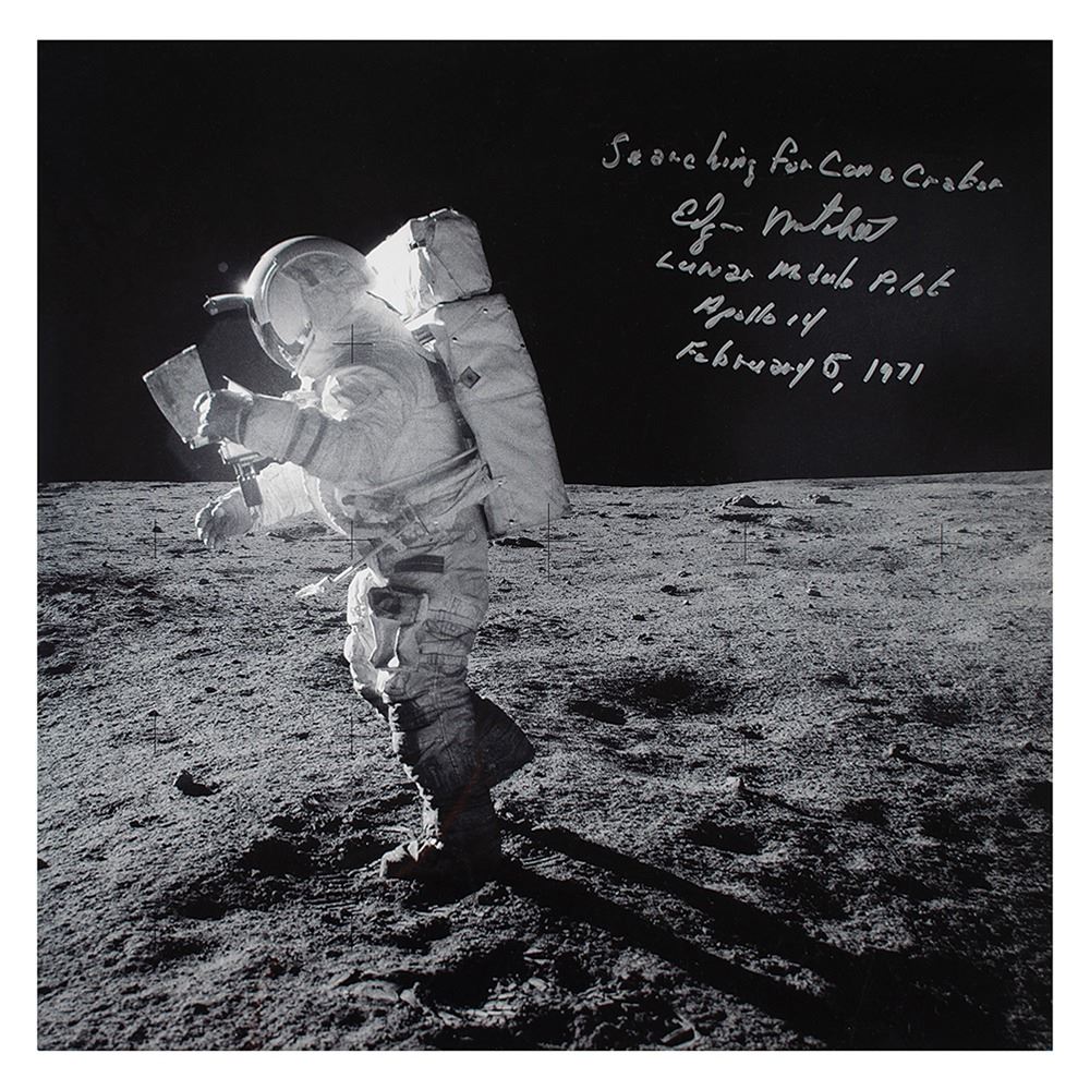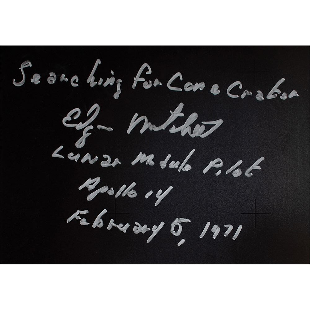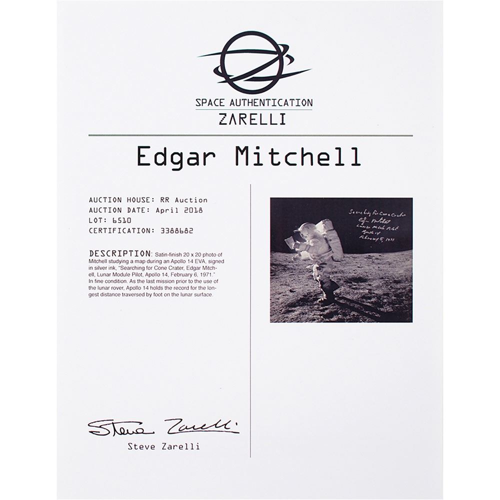 Satin-finish 20 x 20 photo of Mitchell studying a map during an Apollo 14 EVA, signed in silver ink, "Searching for Cone Crater, Edgar Mitchell, Lunar Module Pilot, Apollo 14, February 6, 1971." In very good condition, with overall creasing. As the last mission prior to the use of the lunar rover, Apollo 14 holds the record for the longest distance traversed by foot on the lunar surface. Accompanied by a full letter of authenticity from Zarelli Space Authentication.