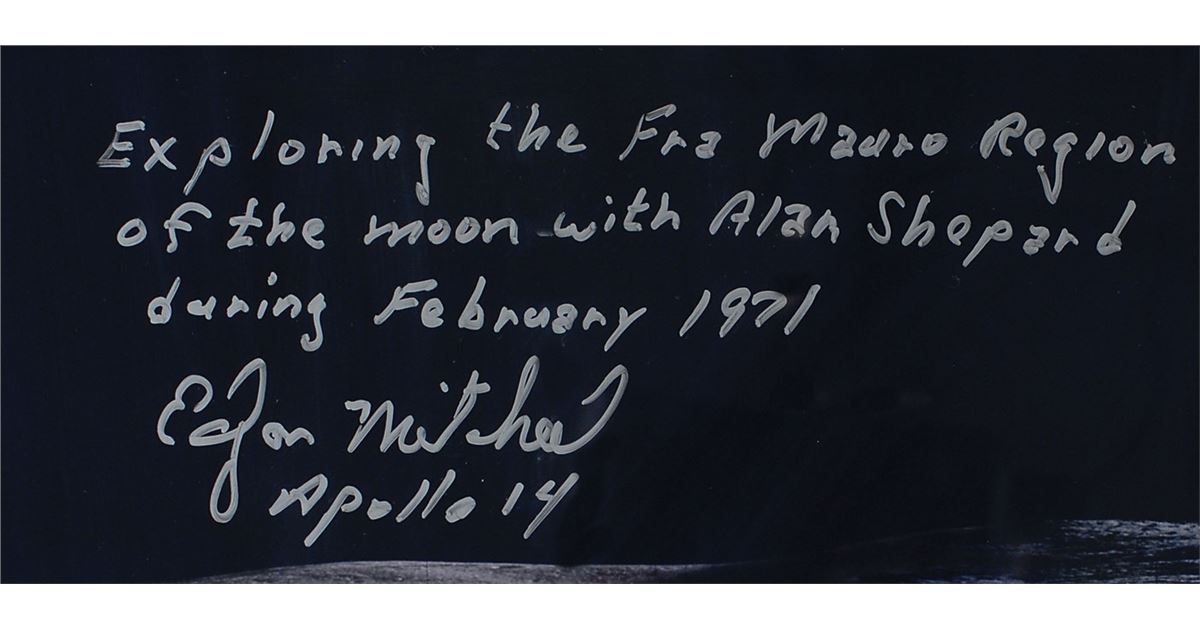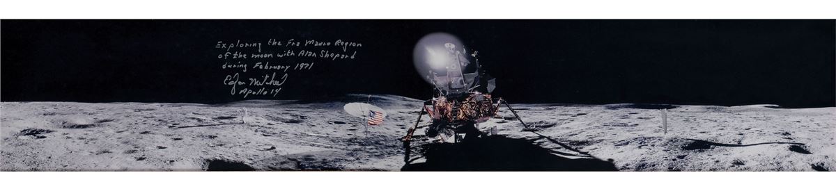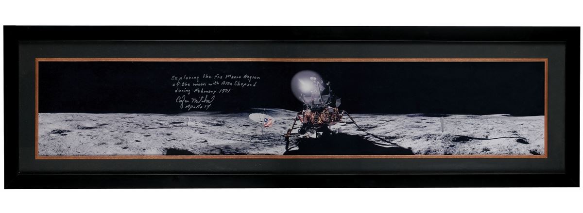 Stunning color satin-finish 39 x 7.25 photo of the Apollo 14 lunar landing site, signed in silver ink, “Exploring the Fra Mauro Region of the moon with Alan Shepard during February 1971, Edgar Mitchell, Apollo 14.” Expertly matted and framed to an overall size of 44.5 x 12.75. In very fine condition. Oversized.