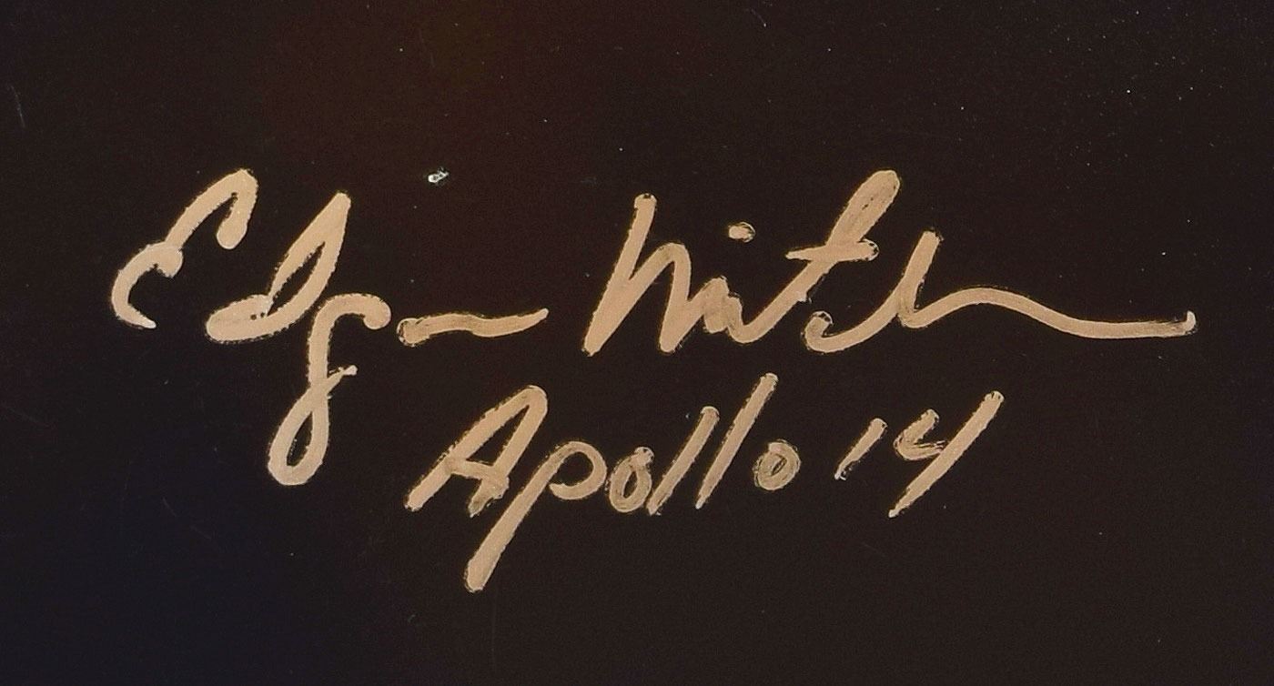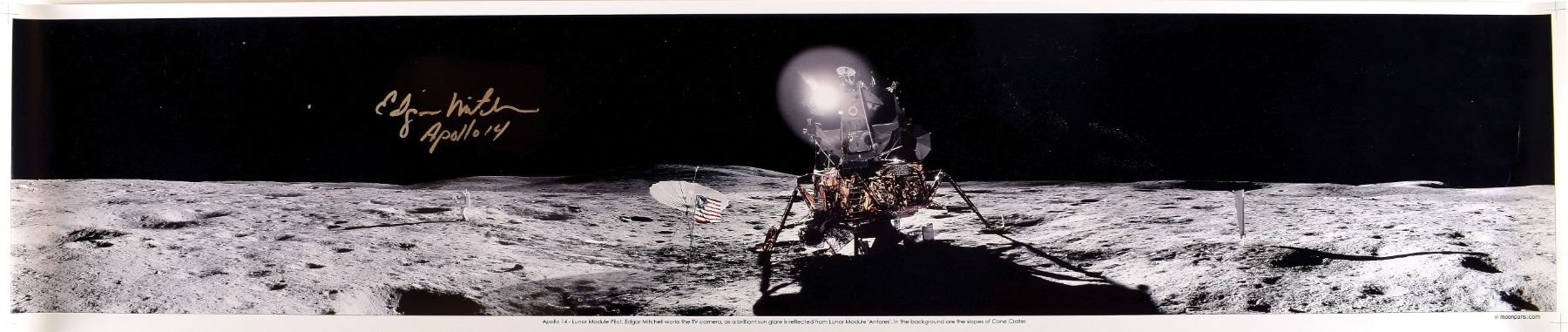 Color satin-finish 40.5 x 8.75 panoramic photo of the Fra Mauro landing site of the Apollo 14 mission, showing Edgar Mitchell working to the left of the Lunar Module Antares, with the slopes of the Cone Crater visible in the background, signed in silver ink, "Edgar Mitchell, Apollo 14." Rolled and in fine condition, with a couple of creases near the side edges.