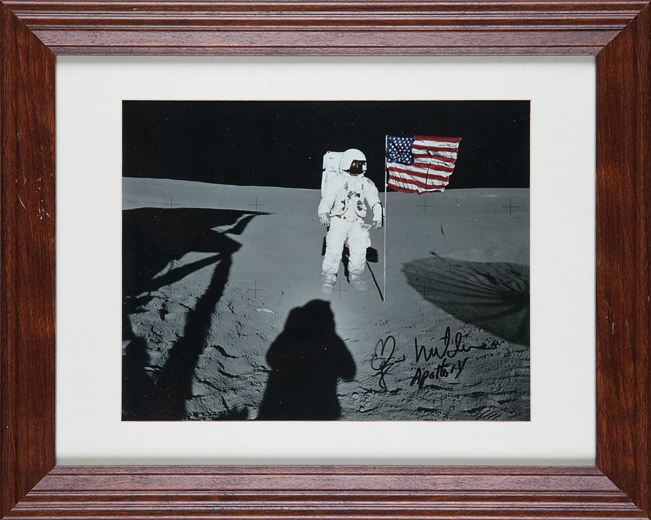 Color satin-finish 9.5 x 7.5 full-length photo of LMP Mitchell standing on the lunar surface next to the American flag, signed in black felt tip, "Edgar Mitchell, Apollo 14." Matted and framed to an overall size of 15 x 12. In fine condition.