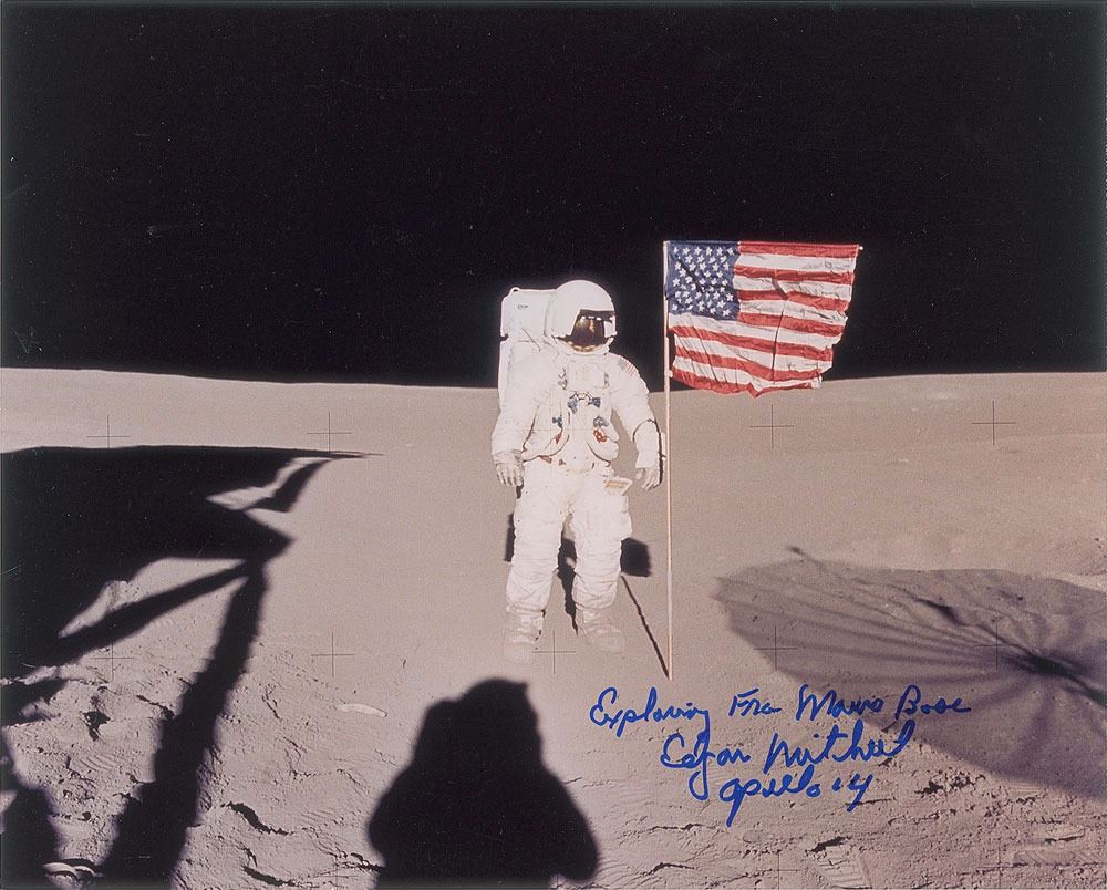 Color semi-glossy 10 x 8 full-length photo of LMP Mitchell standing next to the American flag on the lunar surface, signed in blue felt tip, "Exploring Fra Mauro Base, Edgar Mitchell, Apollo 14." In fine condition.