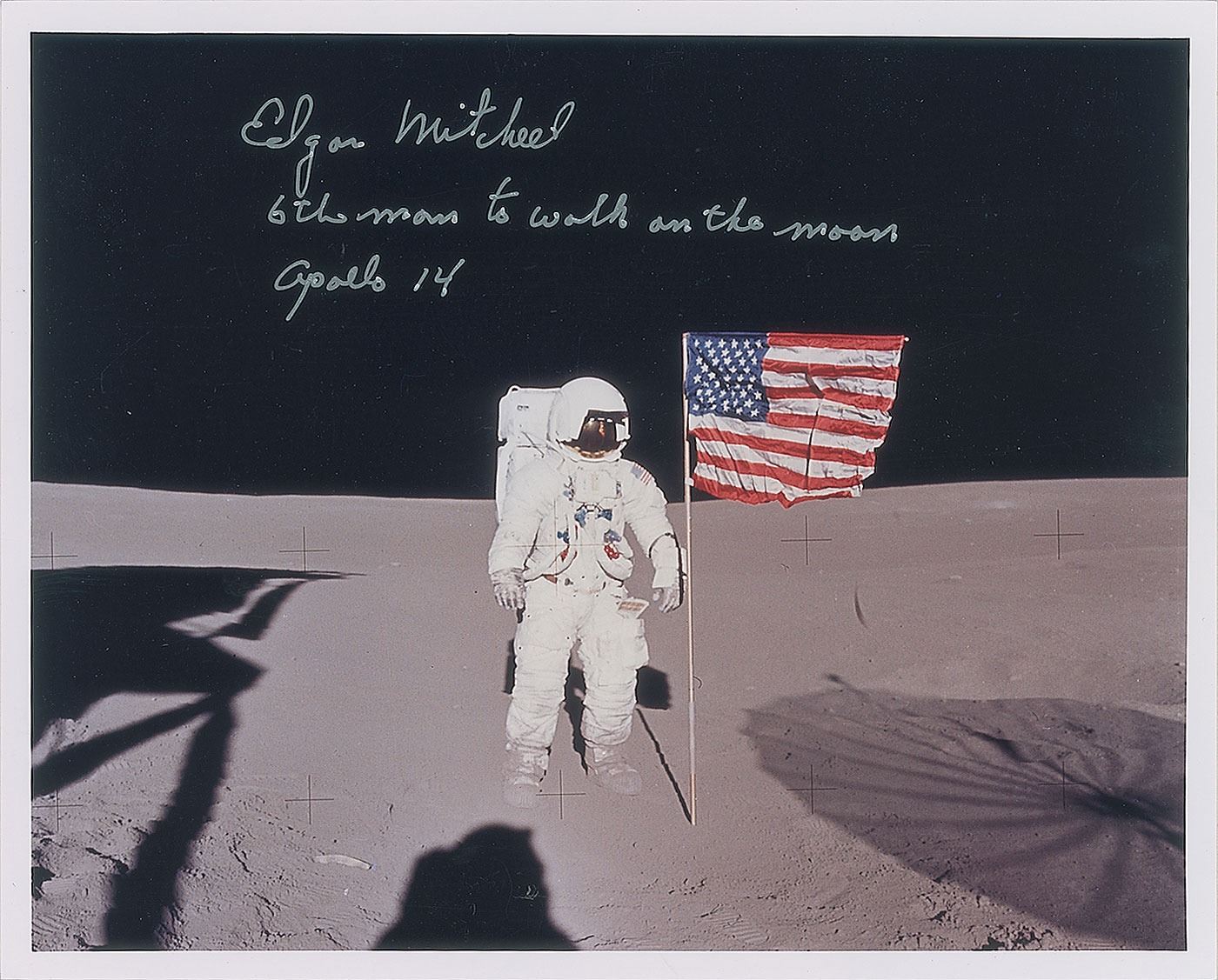 Color semi-glossy 10 x 8 full-length photo of LMP Mitchell standing next to the American flag on the lunar surface, signed in silver ink, "Edgar Mitchell, 6th man to walk on the moon, Apollo 14." In very fine condition.
