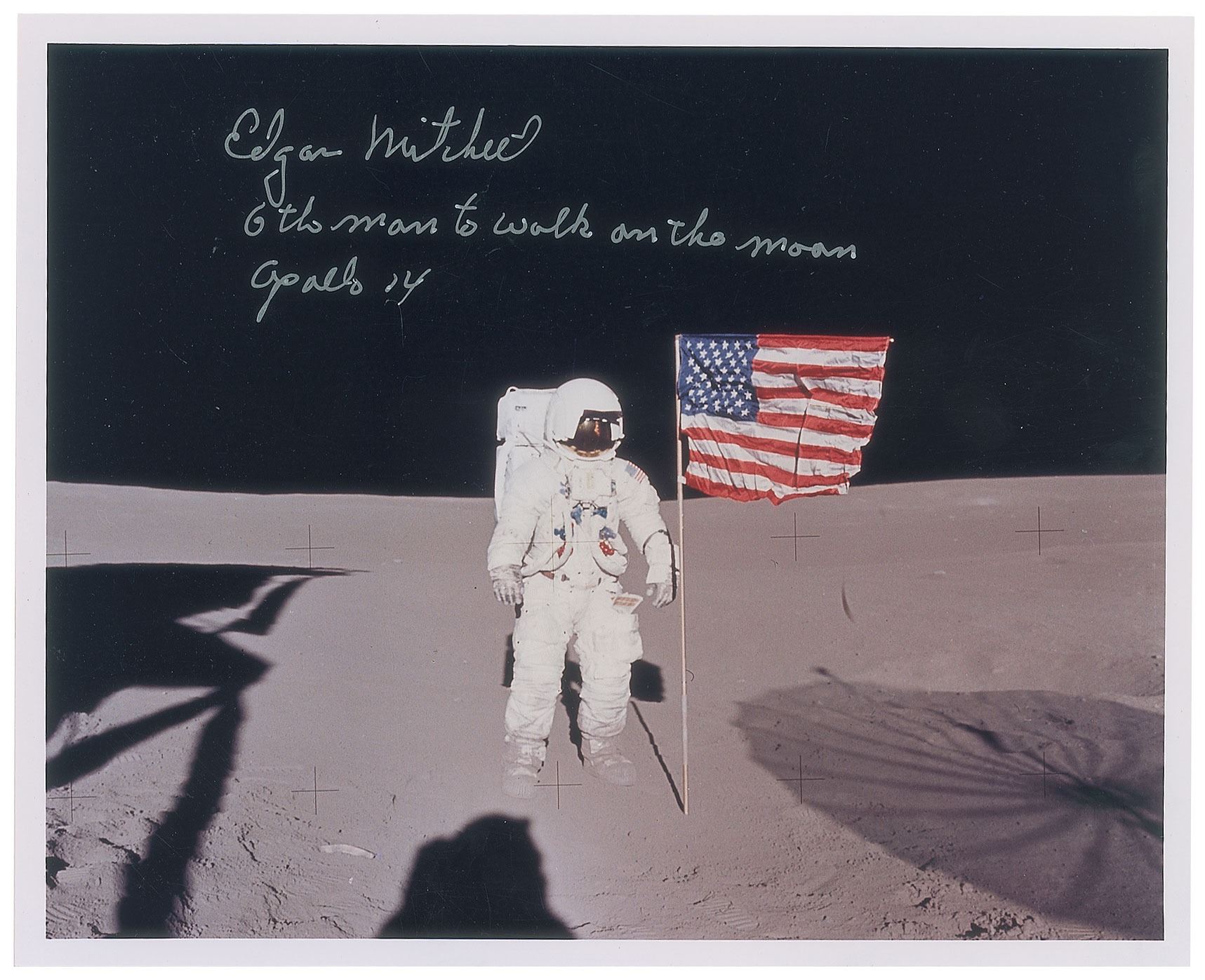 Color semi-glossy 10 x 8 full-length photo of LMP Mitchell standing next to the American flag on the lunar surface, signed in silver ink, "Edgar Mitchell, 6th man to walk on the moon, Apollo 14." In fine condition.