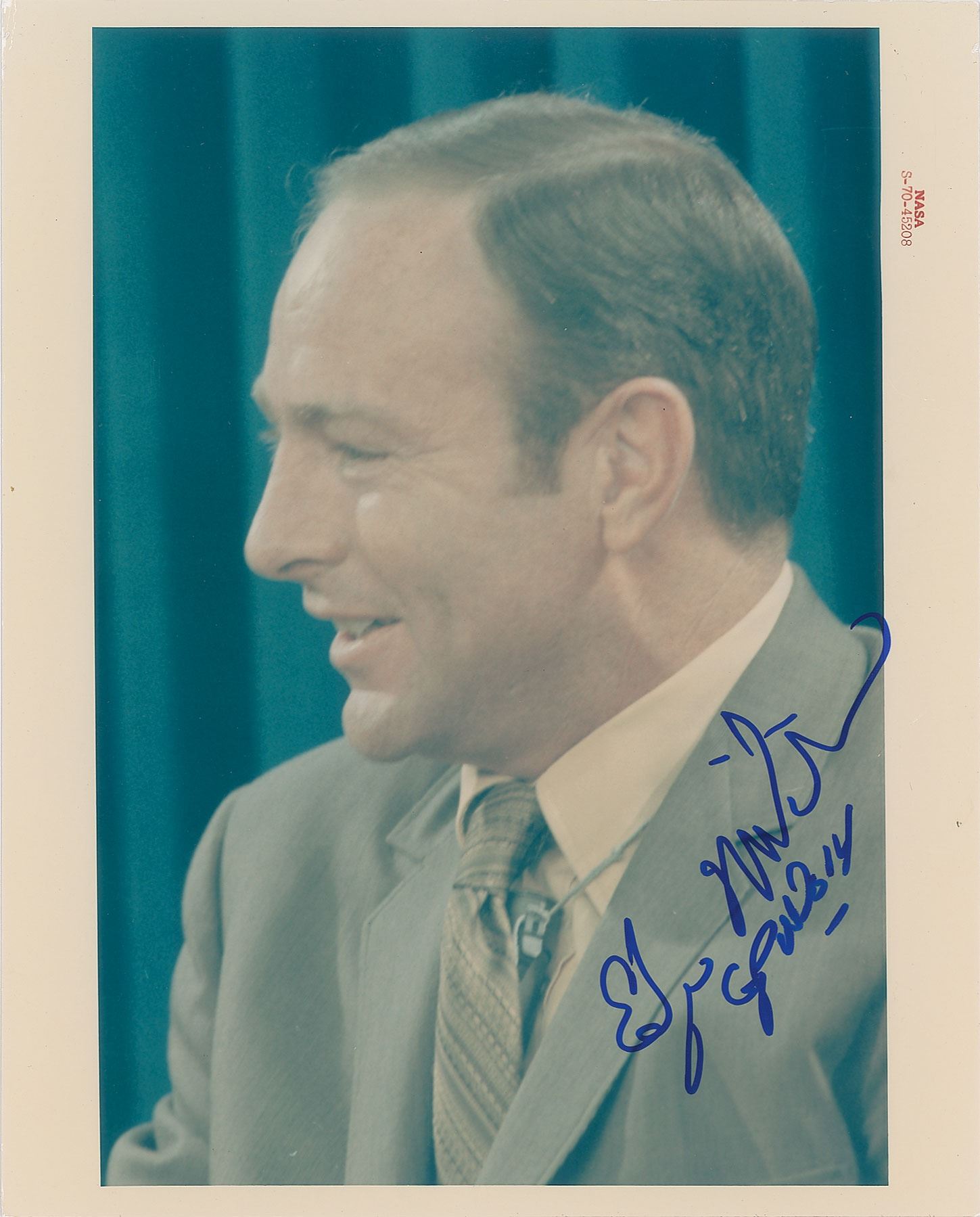 Official color glossy 8 x 10 red-numbered NASA photo of history's sixth moonwalker in a suit and tie, signed in blue felt tip, "Edgar Mitchell, Apollo 14." Reverse bears purple NASA caption text and “A Kodak Paper” watermarks. In fine condition, with some light scratches in the right border.