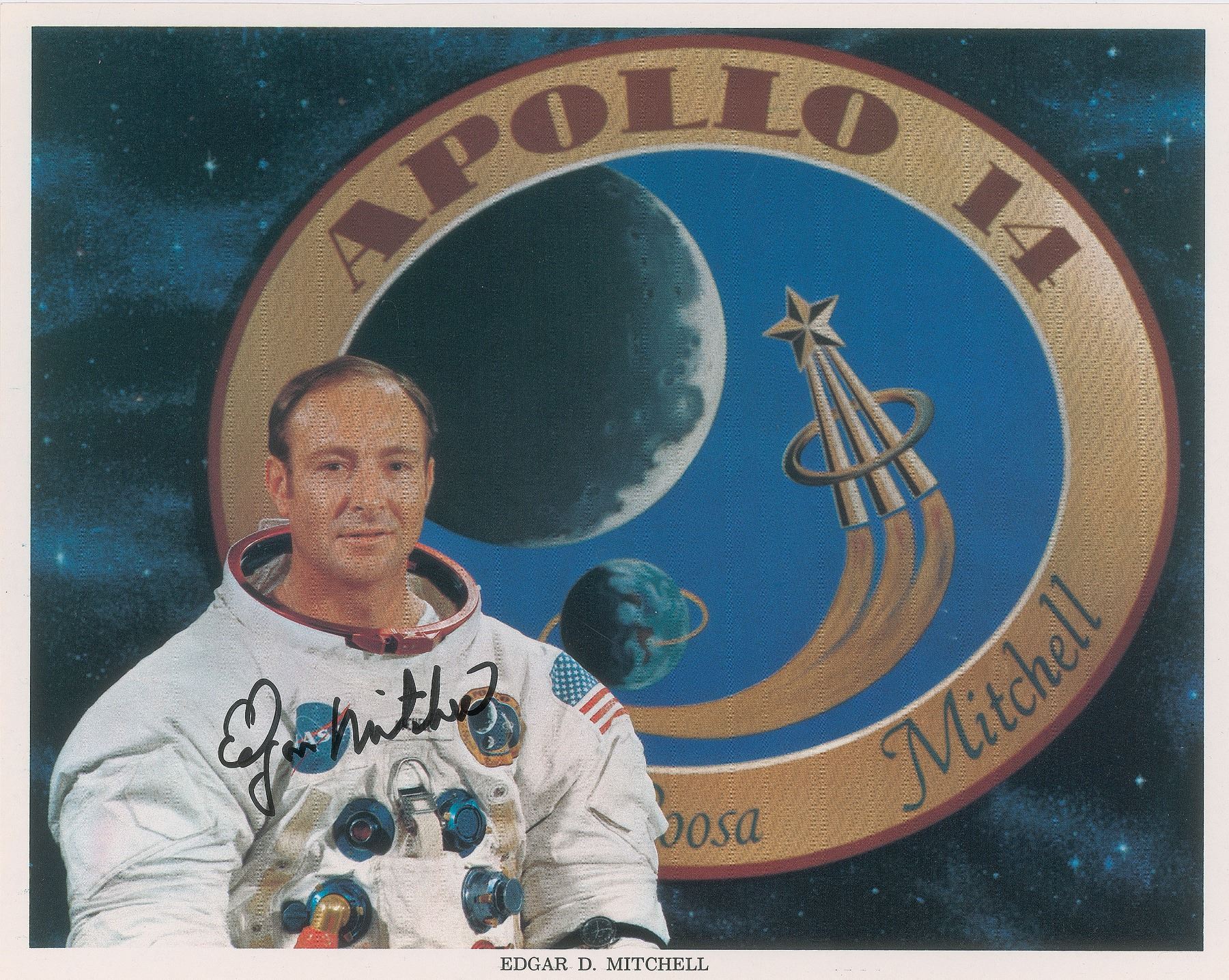 Official color 10 x 8 NASA lithograph of Edgar Mitchell posing in his white space suit against the Apollo 14 mission insignia, signed in black felt tip. In very fine condition.