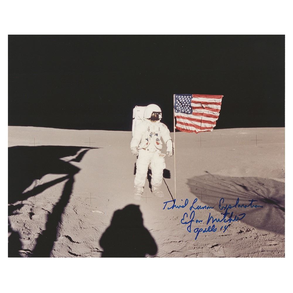 Color semi-glossy 10 x 8 full-length photo of LMP Mitchell standing next to the American flag during the Apollo 14 mission, signed in blue felt tip, "Third Lunar Exploration, Edgar Mitchell, Apollo 14." In fine condition.
