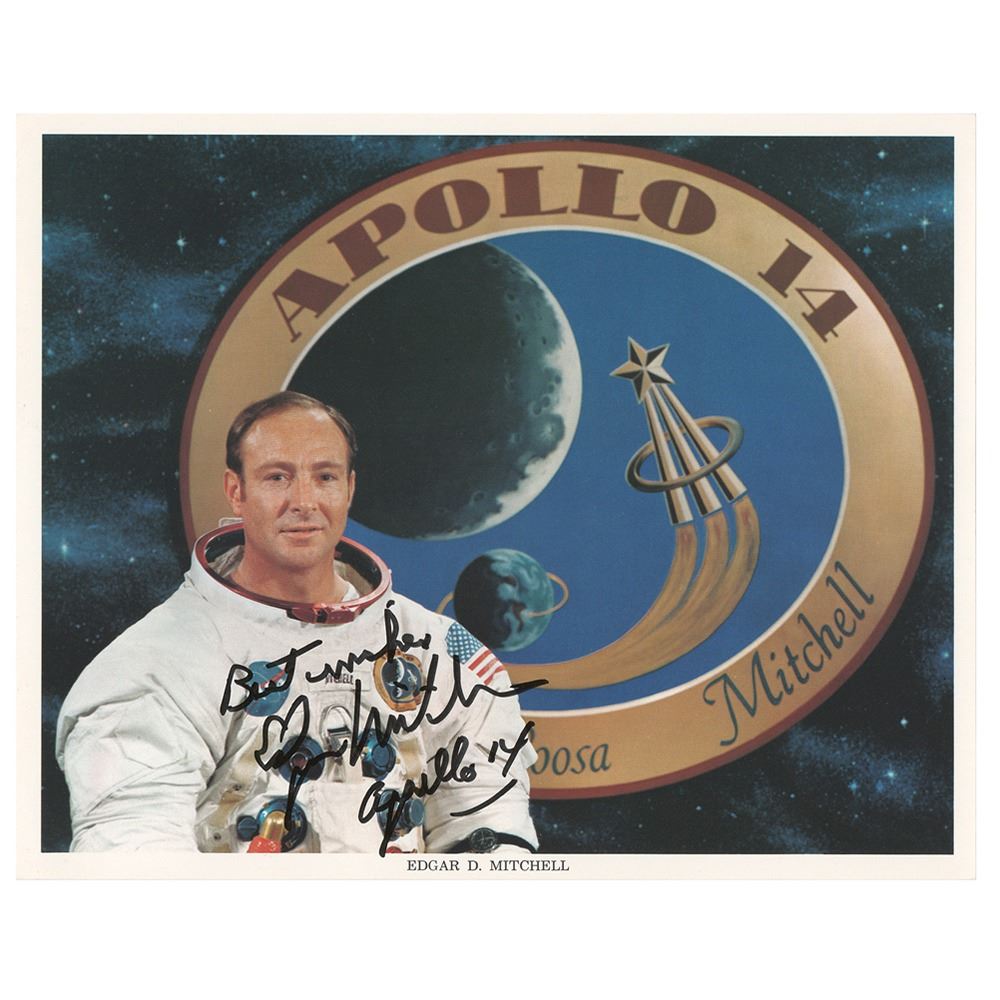 Official color 10 x 8 NASA lithograph of LMP Mitchell posing in his white space suit against a backdrop bearing the Apollo 14 mission insignia, signed in black felt tip, "Best wishes, Edgar Mitchell, Apollo 14." In fine condition.