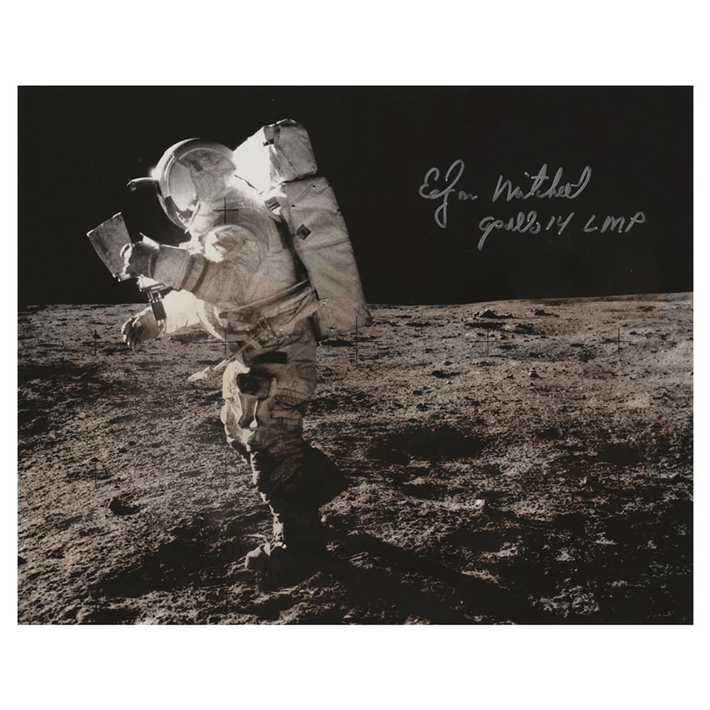 Satin-finish 10 x 8 photo of Mitchell exploring the lunar surface, signed in silver ink, "Edgar Mitchell, Apollo 14 LMP." In fine condition.