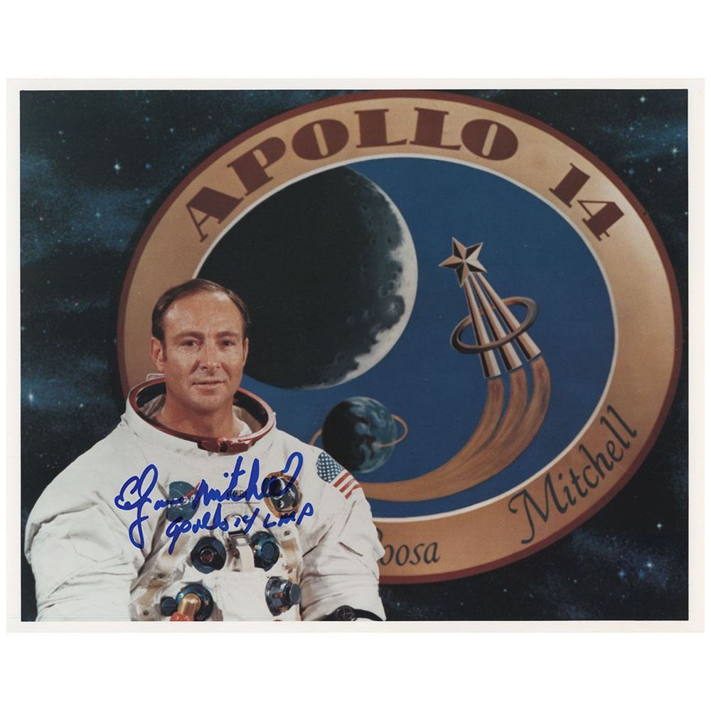 Color satin-finish 10 x 8 photo of LMP Mitchell posing in his white space suit against the Apollo 14 mission insignia, signed in blue felt tip, "Edgar Mitchell, Apollo 14 LMP." In fine condition, with a few small surface creases.