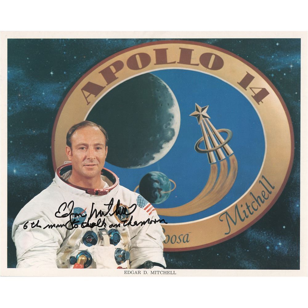 Official color 10 x 8 NASA lithograph of Mitchell posing in his white space suit against the Apollo 14 mission insignia, signed in black felt tip, "Edgar Mitchell, 6th man to walk on the moon, Apollo 14." In fine condition, with a light bend to the upper background area.