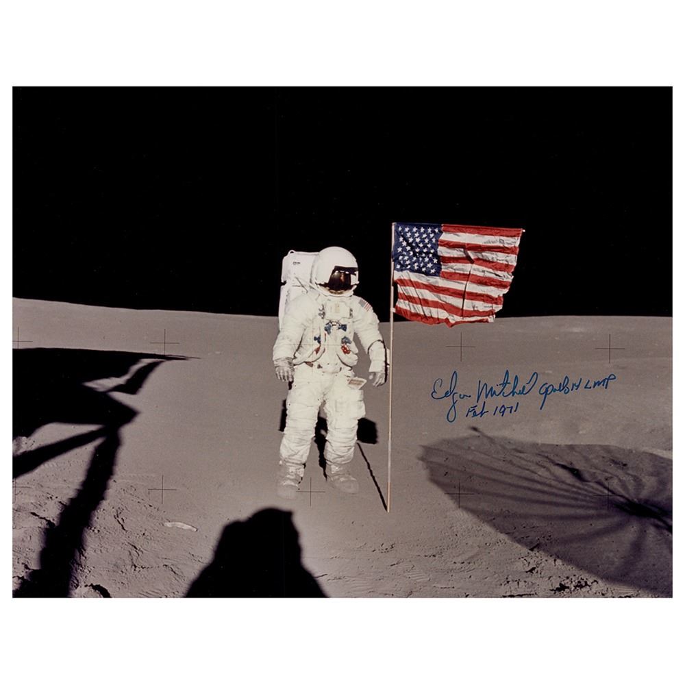 Color semi-glossy 14 x 11 full-length photo of Edgar Mitchell standing next to the American flag on the lunar surface, signed in blue felt tip, "Edgar Mitchell, Apollo 14 LMP, Feb 1971." In fine condition.
