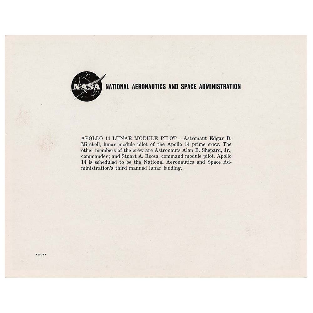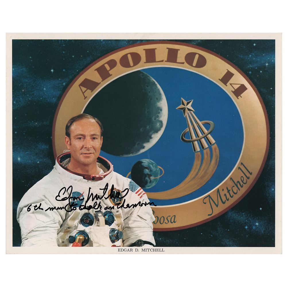 Official color 10 x 8 NASA lithograph of Edgar Mitchell posing in his white space suit against the Apollo 14 mission insignia, signed in black felt tip, "Edgar Mitchell, 6th man to walk on the moon." In fine condition.