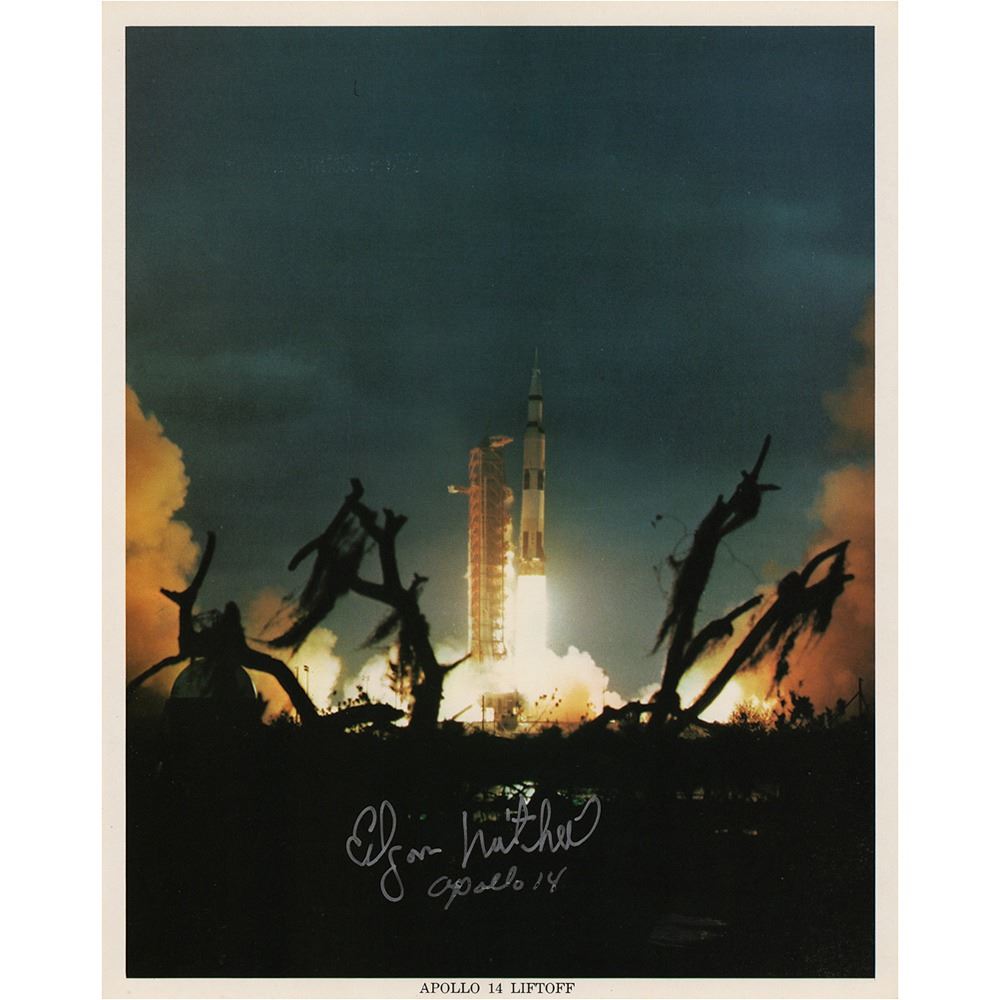 Official color 8 x 10 NASA lithograph of the Apollo 14 liftoff, signed in silver ink, "Edgar Mitchell, Apollo 14." In very fine condition.