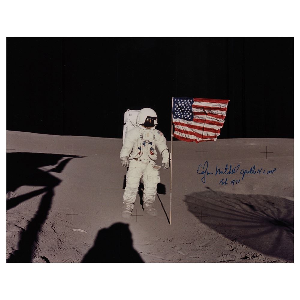 Color satin-finish 14 x 11 photo of Mitchell posing beside the American flag on the lunar surface during an Apollo 14 EVA, signed in blue felt tip, "Edgar Mitchell, Apollo 14 LMP, Feb. 1971." In very fine condition.