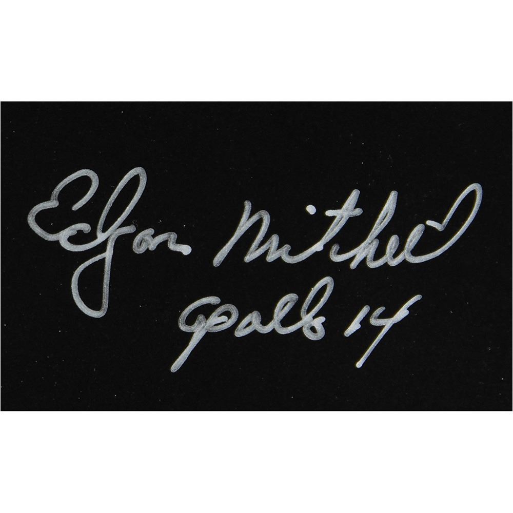 Appealing 11 x 11.25 page removed from the 'Full Moon' photo book, showing the Apollo 14 LM on the lunar surface with a crescent Earth in the distance, nicely signed in silver ink, "Edgar Mitchell, Apollo 14." In fine condition.