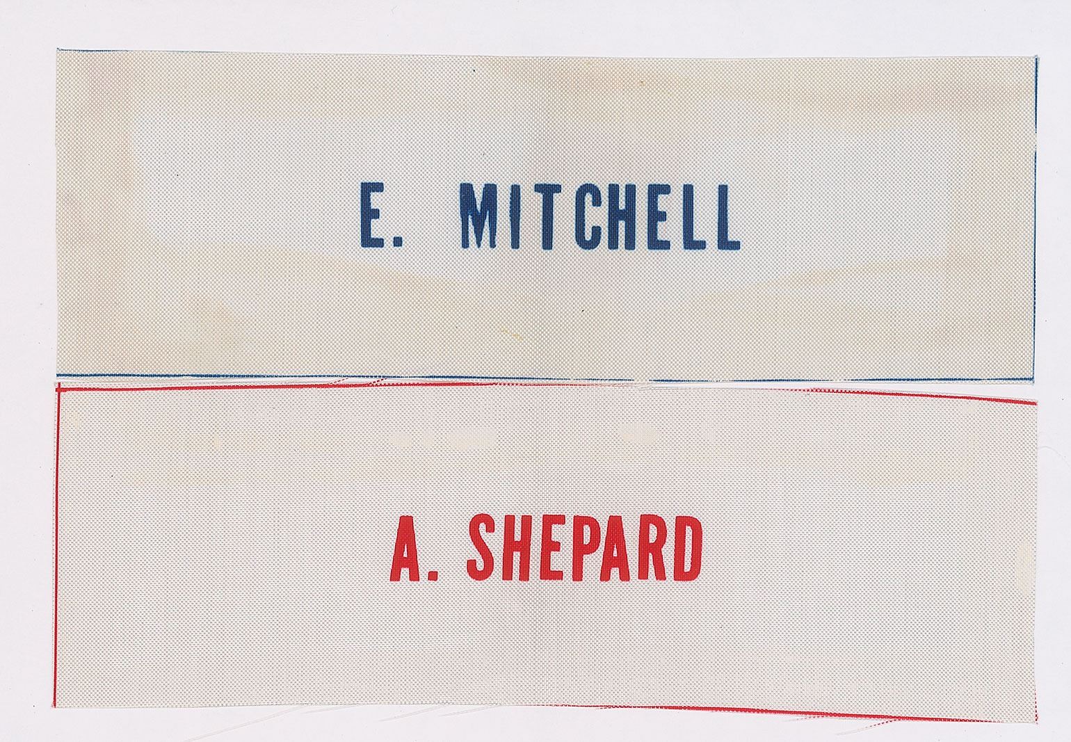 Uncommon pair of Beta cloth name patches, both measure 7.5 x 2.5, with one identified in red block text, "A. Shepard," and the other in blue block text, "E. Mitchell." In overall fine condition, with light staining to Mitchell.
