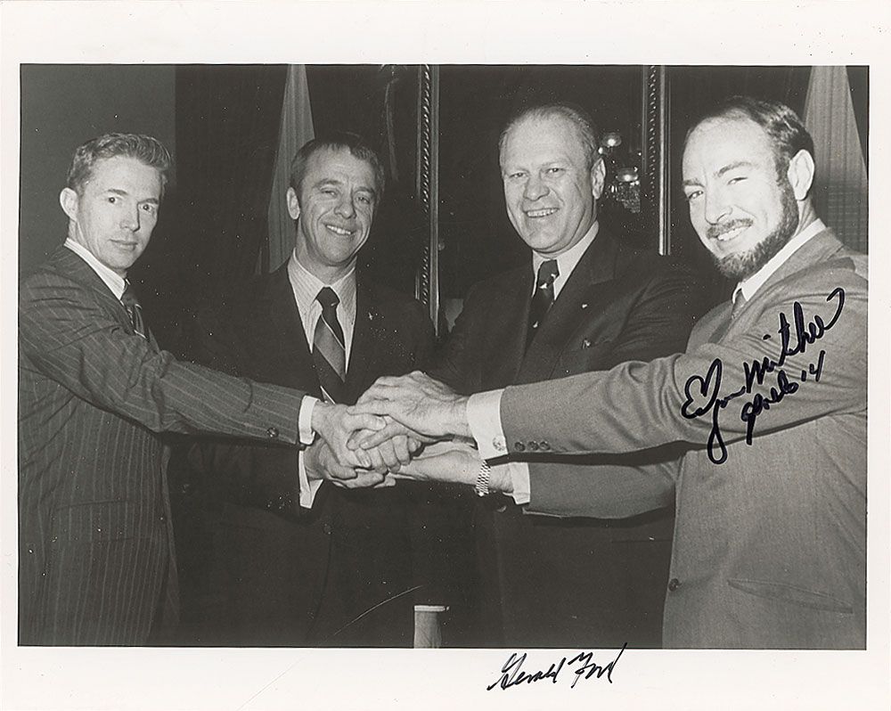Glossy 10 x 8 photo of Ford shaking hands with the Apollo 14 crew, signed in black felt tip by Edgar Mitchell and Gerald Ford. In very fine condition.