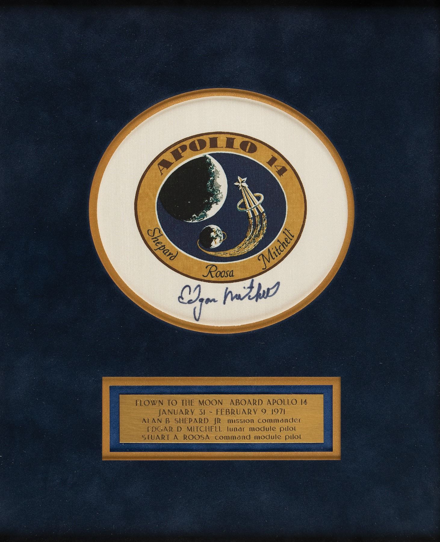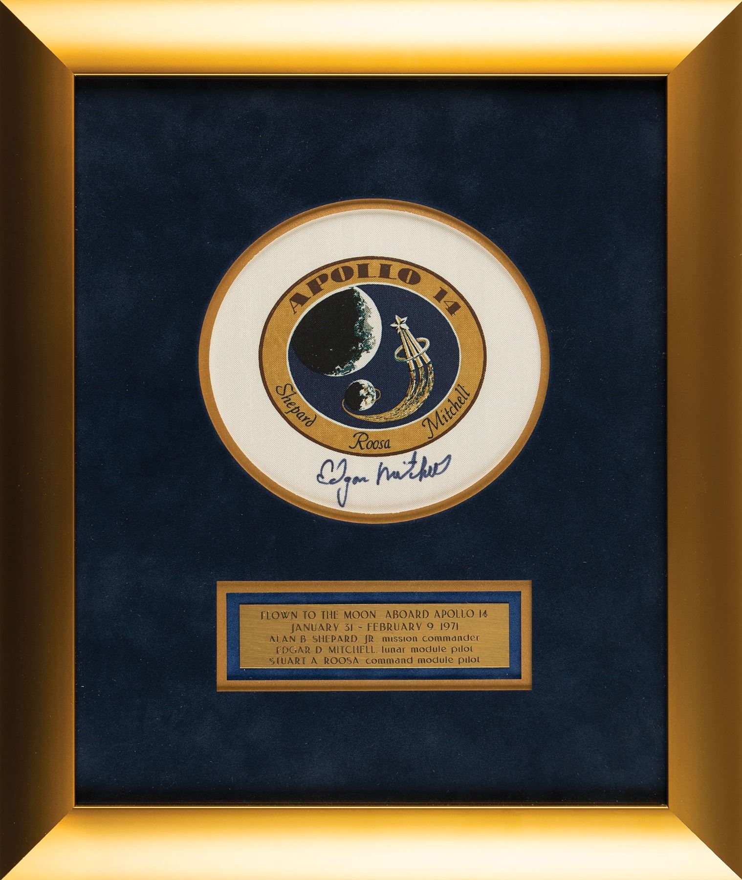 Fantastic flown Beta patch carried to the moon on the Apollo 14 Command Module 'Kittyhawk,' featuring the mission insignia at center, 6˝ x 5.25˝, signed below the emblem in black felt tip, "Edgar Mitchell." Handsomely custom double-matted and framed with a descriptive plaque to an overall size of 13.25˝ x 15.75˝. In fine condition. Accompanied by a Novagraphics (now Novaspace) certificate of authenticity signed by Mitchell, certifying that this "patch was vacuum packed and stowed aboard Kittyhawk as part of the Lunar Module Pilot's CM Personal Preference Kit (PPK) serial number 1039."