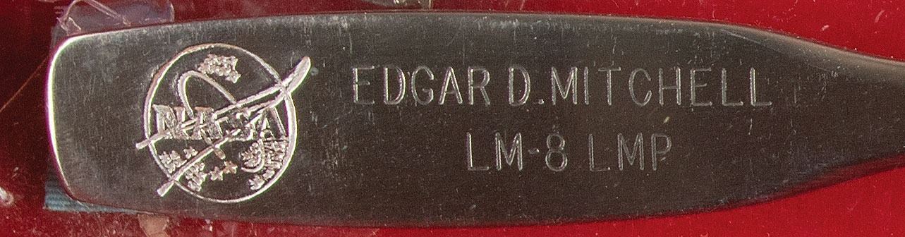 Incredible flown spoon carried to the lunar surface during the Apollo 14 mission and used by Edgar Mitchell as his exclusive eating utensil in the Lunar Module Antares. The spoon measures 7˝ in length, with the handle featuring the NASA logo and engraved text: "Edgar D. Mitchell, LM-8 LMP." The spoon is accompanied by its original plastic packaging with Velcro swatch, as well as by a color photo of Mitchell holding the spoon inside its packaging, with Mitchell signing in black felt tip below a preprinted statement: "This is my Apollo 14 Lunar Module Spoon, which was my eating utensil in the Antares on the Moon!"