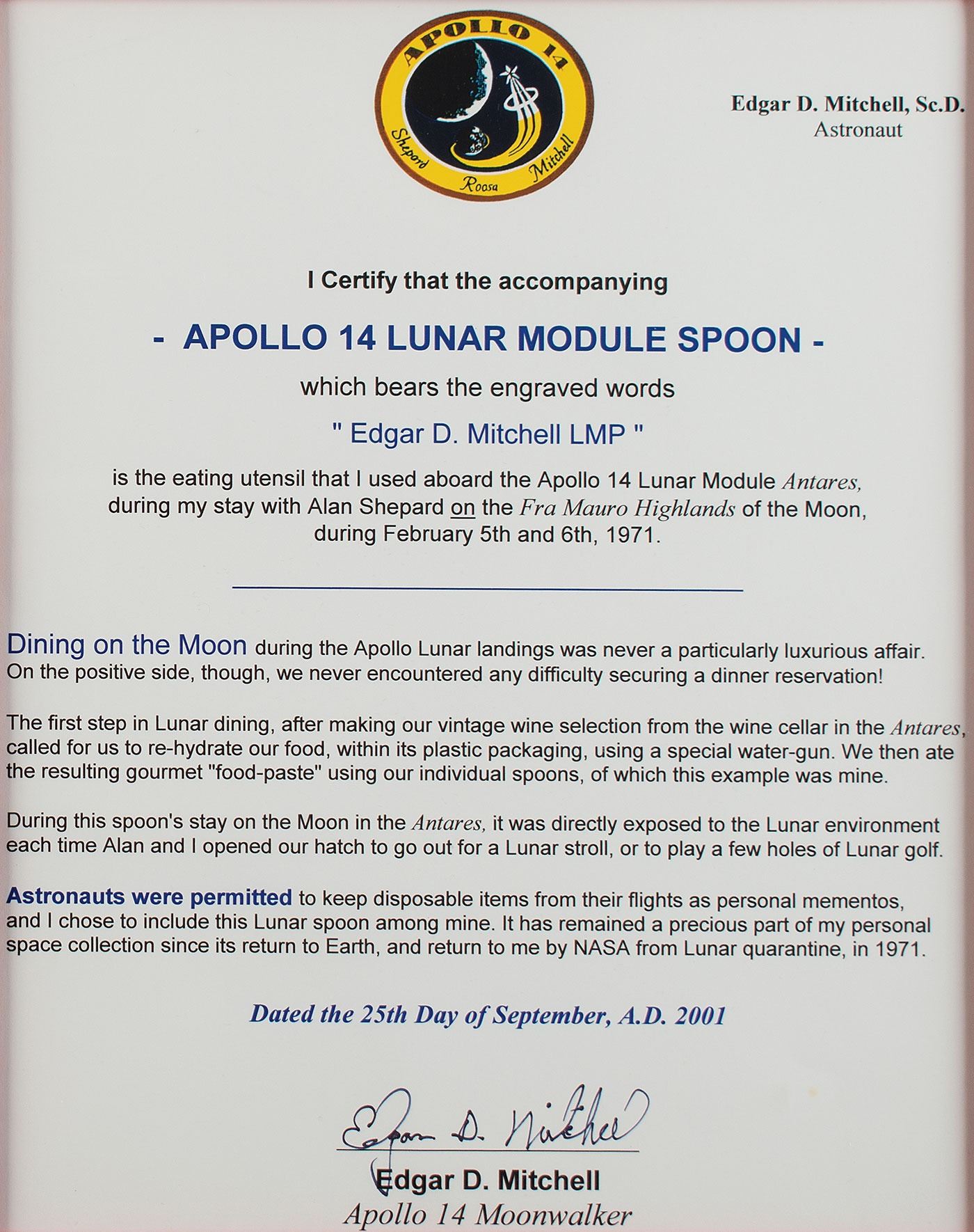Also included is a signed certificate of authenticity from Mitchell, who states: “I Certify that the accompanying Apollo 14 Lunar Module Spoon which bears the engraved words ‘Edgar D. Mitchell LMP’ is the eating utensil that I used aboard the Apollo 14 Lunar Module Antares, during my stay with Alan Shepard on the Fra Mauro Highlands of the Moon, during February 5th and 6th, 1971.”