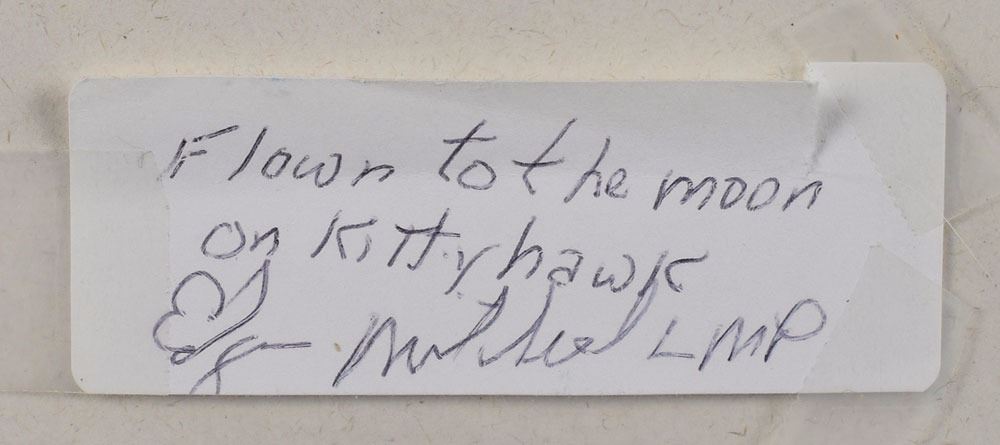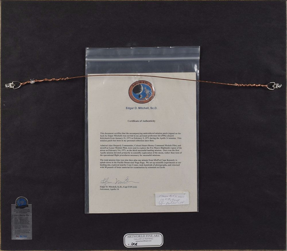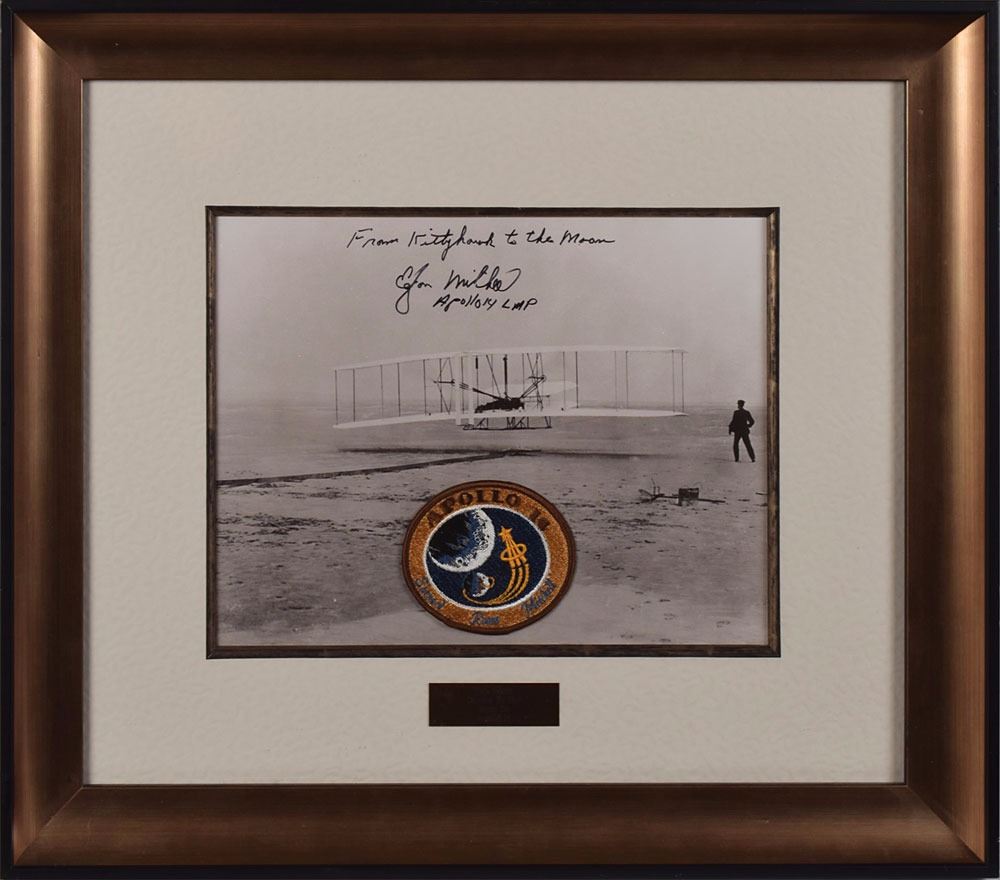 Flown embroidered Apollo 14 mission patch carried into lunar orbit aboard the Command Module Kitty Hawk during the Apollo 14 mission, measuring 4 x 3.5, affixed to a glossy 12.75 x 10 photo of the Wright Brothers' first airplane flight at Kitty Hawk, North Carolina, signed and flight certified in black felt tip, "From Kitty Hawk to the Moon, Edgar Mitchell, Apollo LMP." Archivally matted and framed with an engraved plate to an overall size of 22.75 x 20; the label originally affixed to reverse of patch, also signed and certified by Mitchell, "Flown to the moon on Kittyhawk, Edgar Mitchell LMP," is taped to a plastic pouch attached to frame backing. In fine condition. Accompanied by a signed certificate of authenticity from Mitchell, in part: "This document certifies that the accompanying embroidered mission patch…was carried in my personal preference kit (PPK) aboard Kittyhawk from January 31, 1971 to February 9, 1971 during the Apollo 14 mission. This mission patch has been in my personal collection since then." An immensely appealing union of man's first flight and the third successful lunar landing mission—CMP Stuart A. Roosa said that he selected the callsign Kitty Hawk for the command module because 'that's where it all started.'