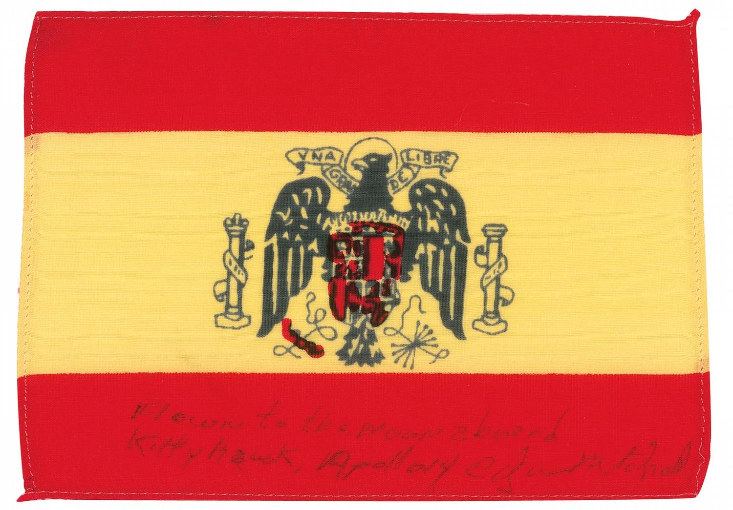 Flight-flown printed fabric Spanish flag, 5.75 x 4, carried aboard the Apollo 14 mission, and orbited the moon aboard the Command Module Kitty Hawk, signed in black ink, “Flown to the Moon aboard Kittyhawk, Apollo 14, Edgar Mitchell.” Note that the current flag of Spain does not feature the eagle and shield; this flown flag is of the design used during the period 1945-1977. In fine condition. Flag originally comes from Mitchell’s personal collection. Flight-flown foreign flags are less common than United States flags.