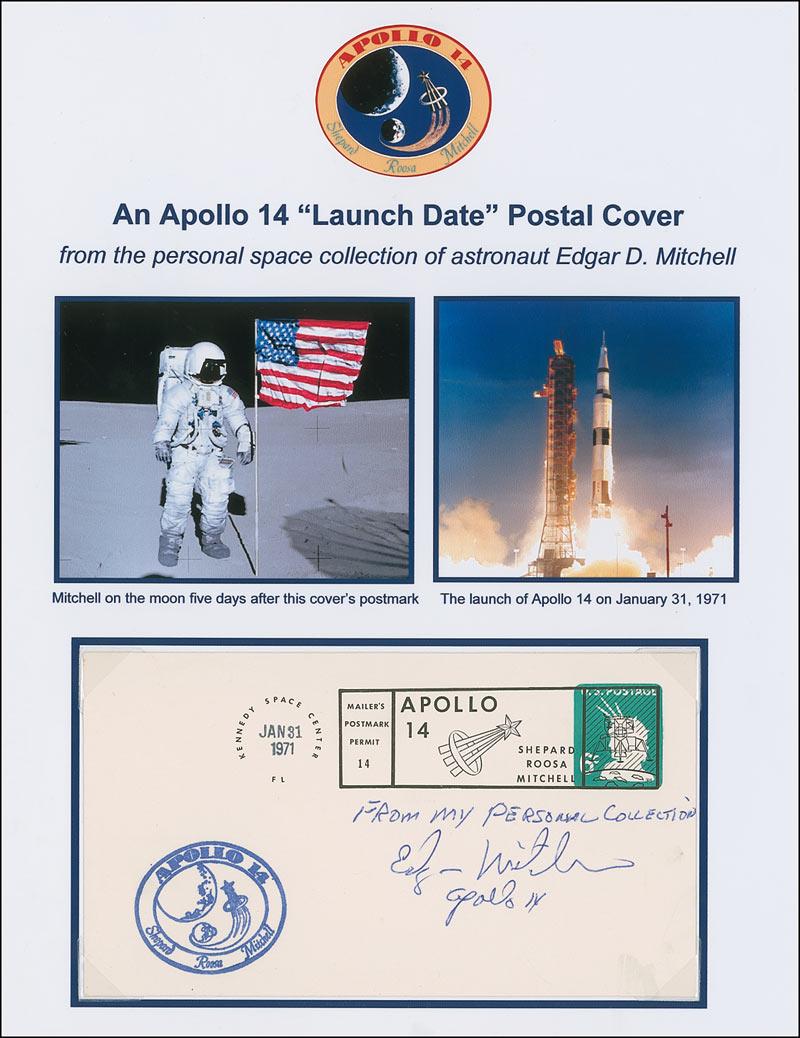 Apollo 14 launch date postal cover with a stamped cachet honoring Apollo 14, signed on the front in blue ballpoint, “From my personal collection, Edgar Mitchell, Apollo 14.” Removably presented on a color 8.5 x 11 informational sheet. In very fine condition.