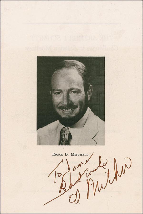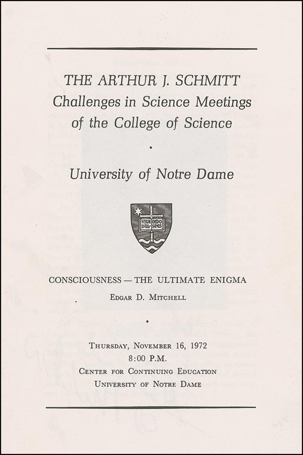Program from the Arthur J. Schmitt Challenges in Science Meetings of the College of Science at Notre Dame, held on November 16, 1972, 6 x 9, two pages, signed and inscribed inside, under his image, in brown felt tip, “To Jane, Best wishes, Ed Mitchell.” In fine condition, with some light handling wear.