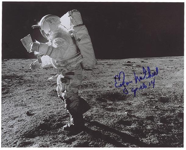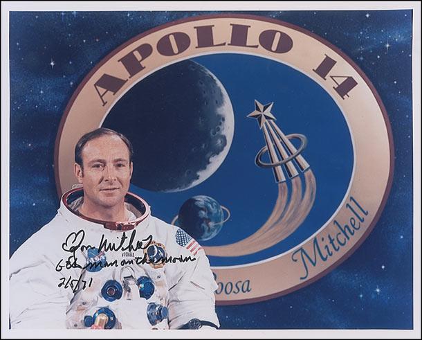 Two color satin-finish photos: a color image of Mitchell in his spacesuit in front of the Apollo 14 insignia, signed in black felt tip, “Edgar Mitchell, 6th man on the moon 2/5/71”; and a photo of Mitchell on the moon, signed in blue felt tip. In fine condition.