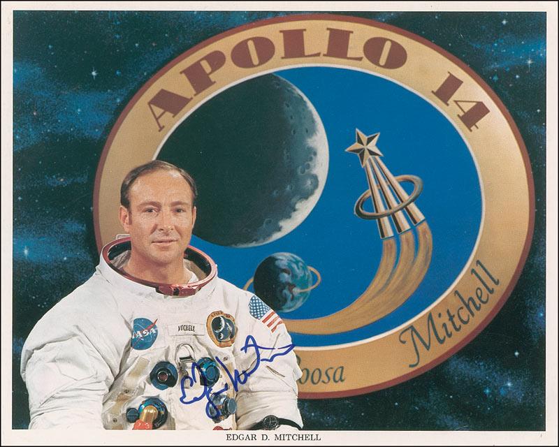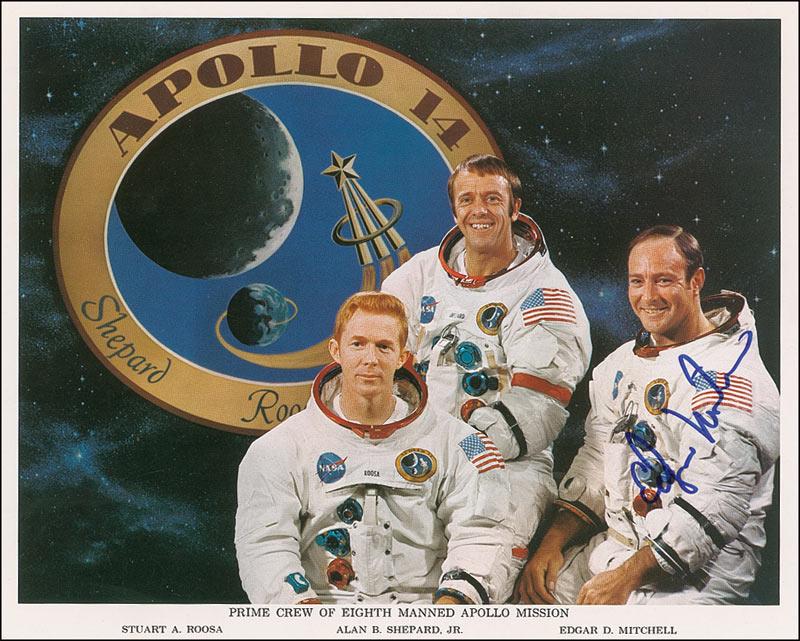 Two items: a color 10 x 8 NASA photo of Mitchell posing in his space suit in front of the Apollo 14 mission emblem, signed in blue felt tip; and a color 10 x 8 NASA photo of Mitchell posing with Stuart A. Roosa and Alan B. Shepard, Jr. in front of the Apollo 14 mission emblem, signed in blue felt tip. In fine condition.