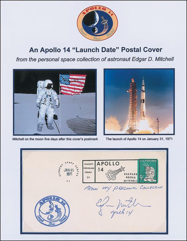 Apollo 14 launch date postal cover with a stamped cachet honoring Apollo 14, signed on the front in blue ballpoint, “From my personal collection, Edgar Mitchell, Apollo 14.” Removably presented on a color 8.5 x 11 informational sheet. In fine condition.
