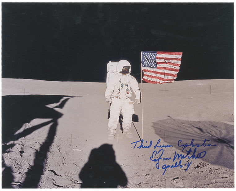 Beautiful color satin-finish 10 x 8 photo of Mitchell standing next to the American flag on the lunar surface, signed in blue felt tip, “Third Lunar Explorer, Edgar Mitchell, Apollo 14.” In very fine condition.