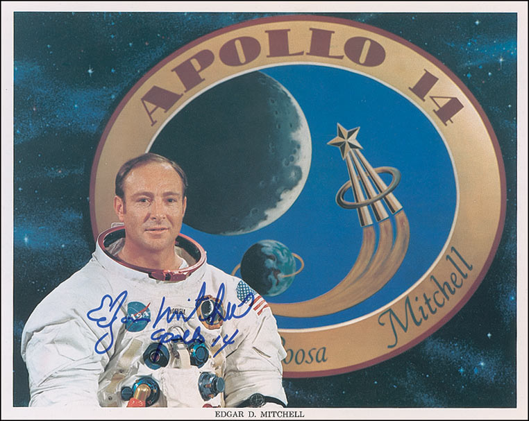 Color 10 x 8 NASA photo of Mitchell posing in his space suit in front of the Apollo 14 mission emblem, signed in blue felt tip “Edgar Mitchell, Apollo 14.” In fine condition.