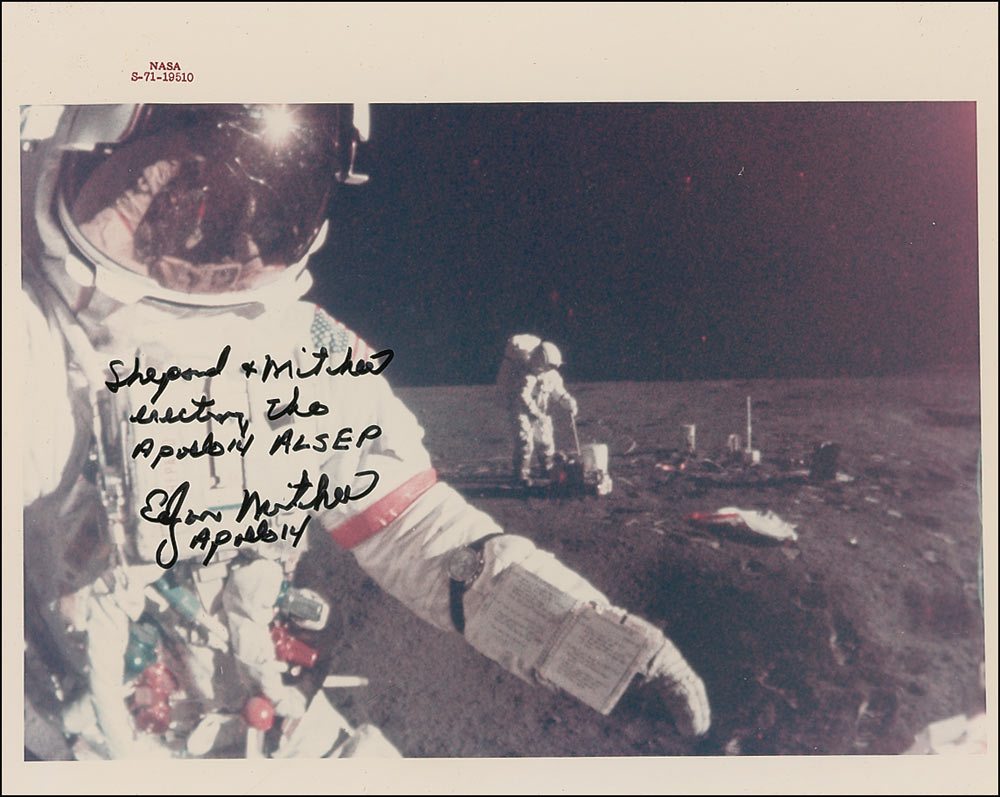 Color satin-finish 8 x 10 NASA ‘red letter’ photo of astronauts Alan Shepard and Ed Mitchell on the lunar surface, signed in black felt tip “Shepard & Mitchell erecting the Apollo 14 ALSEP. Edgar Mitchell, Apollo 14.” In fine condition.